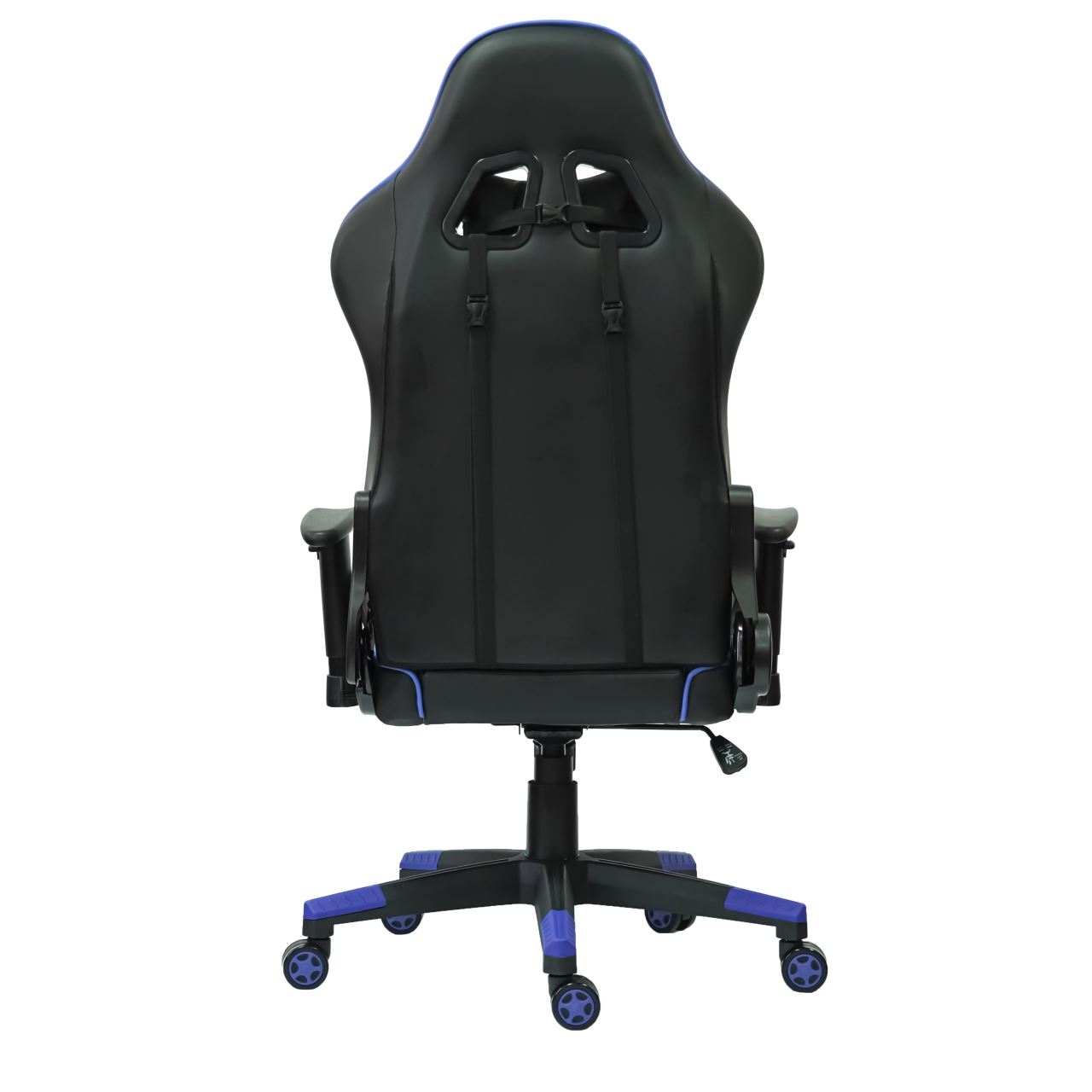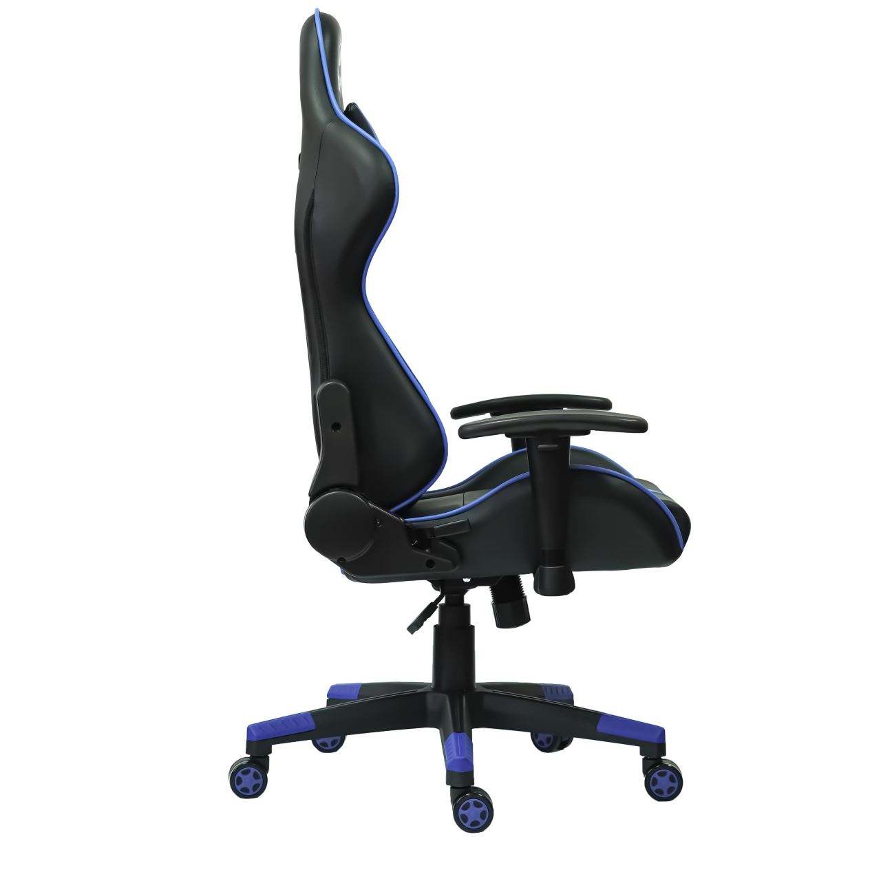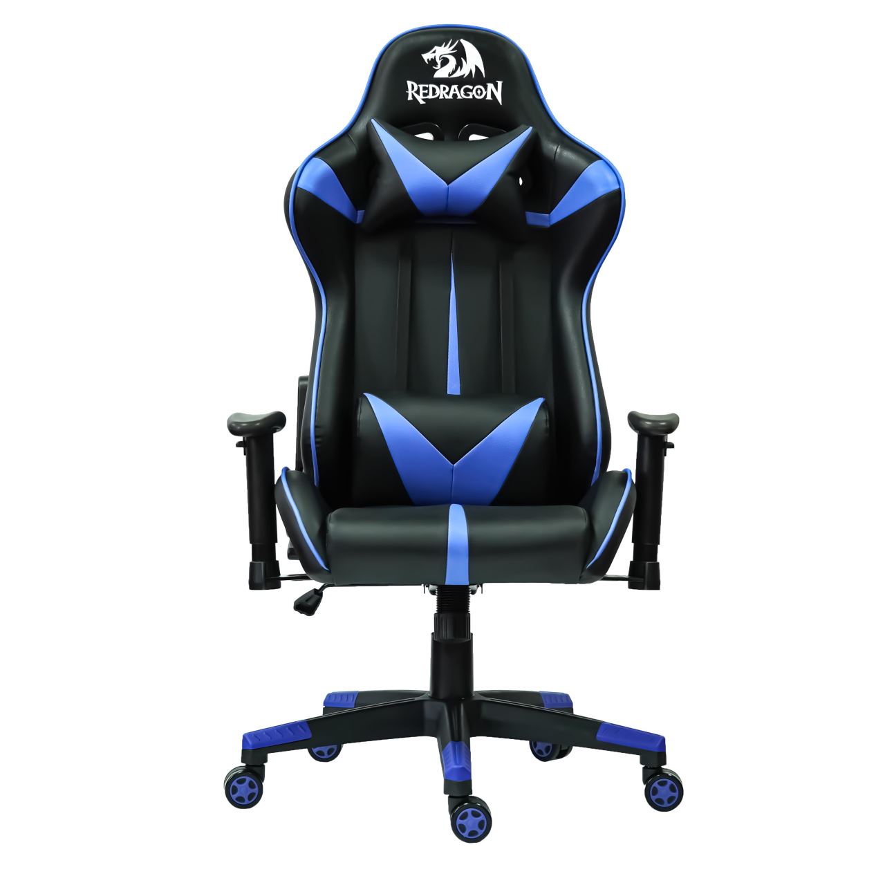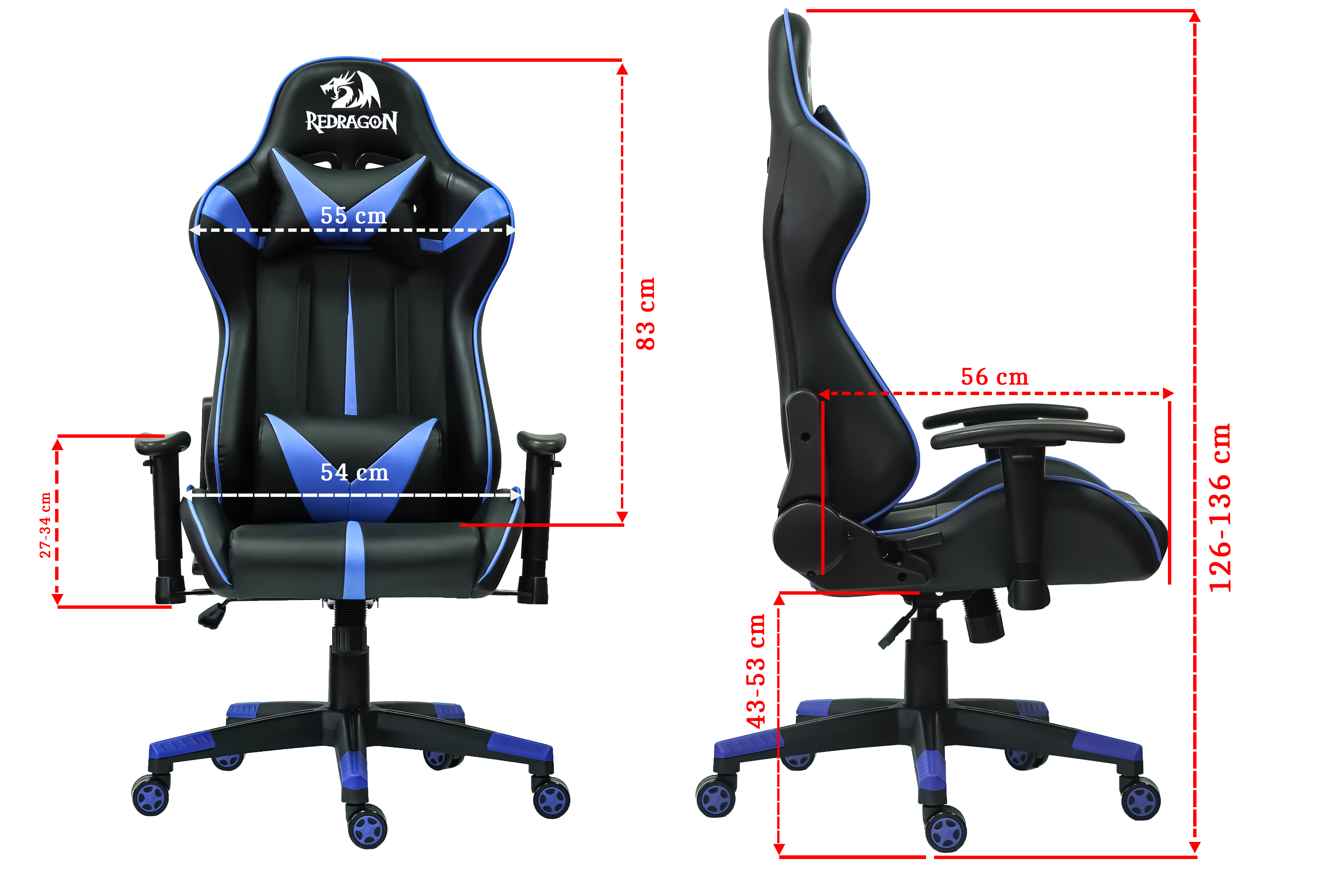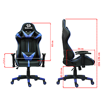Scaun gaming Redragon Rampage negru cu albastru, permite diverse reglaje: inaltime, inclinare, rotire 360°, manere 2D, inaltime scaun: 126-136cm, inaltime sezut: 43-53cm, inaltime spatar: 83cm, latime spatar: 55cm, latime sezut: 54cm, adancime sezut: 56cm,reglaj inaltime manere: 27-34cm material captuseala: Leather style Vynil, echipat cu piston cu gaz clasa 3, inclinare spatar: 90°
