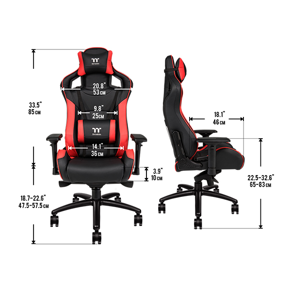 Scaun gaming Thermaltake X Fit negru cu rosu, cadru din otel, baza din aluminiu, captusit cu spuma densa (75kg/m3 pentru spatar si 55kg/m3 pentru sezut) pentru ergonomie si conform ridicate, permite diverse reglaje: inaltime, inclinare 85°-160°, rotire 360°, manere reglabile 4D, material captuseala: piele naturala, mecanism tip “Z”, echipat cu piston cu gaz clasa 4, adancime zona sezut: 46cm, latime zona sezut: 36cm, inaltime scaun reglabila: 48-58cm, inaltime spatar: 85cm, latime spatar: 53cm, inaltime scaun: 132.5-142.5cm, greutate maxima: 120kg, greutate scaun: 27kg