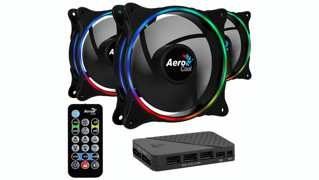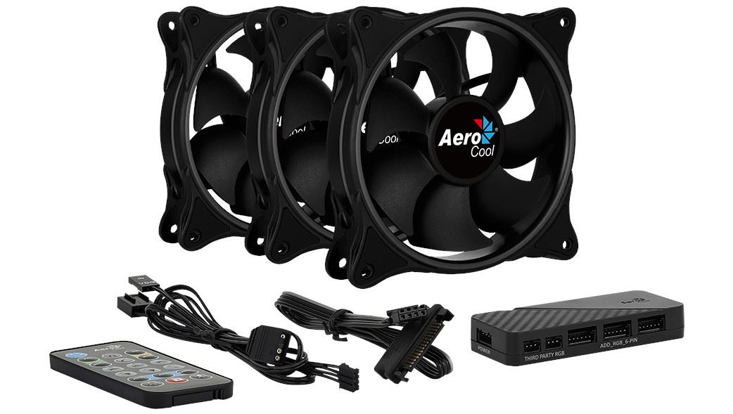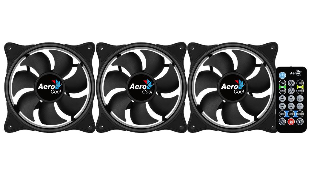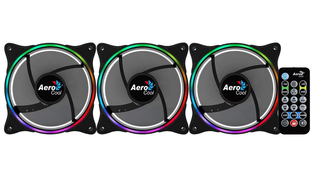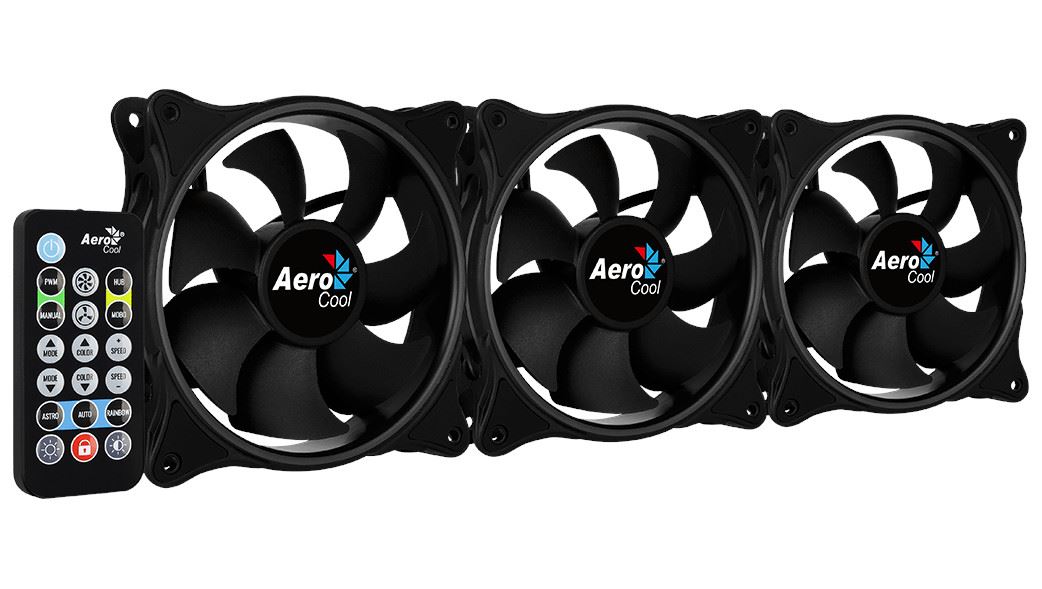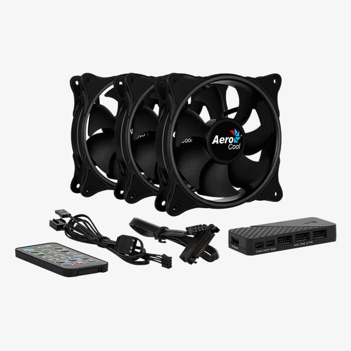 Set 3 ventilatoare Aerocool Eclipse Pro 120mm iluminare aRGB, iluminare LED aRGB (12 LED-uri), rulmenti de tip Hydraulic Bearing, sistem de montare anti-vibratii, 1200 RPM, 32.1 CFM, 19.8 dBA, 1.27 mmH2O, cablu plat, dimensiuni: 120x120x25mm, conectori: VDG / adressable header / 6pin / 4pin, MTBF: 60000h, include controller RGB Aerocool H66F (se pot monta maxim 6 ventilatoare) si telecomanda