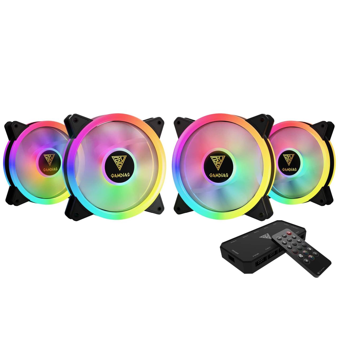 Set 4 ventilatoare Gamdias Aeolus M2 1204R 120mm iluminare RGB, iluminare Ring LED adressable RGB pe ambele fete ale ventilatorului si in centrul palelor cu 55 de moduri de iluminare, tip rulmet: Hydraulic Bearing, 500-1500 RPM±10%, 66 CFM, 17 - 23 dBA, 1.94 mmH2O, cablu plat, include telecomanda si hub (suporta pana la 8 ventilatoare si 2 benzi LED), compatibil iesirile de LED adresabil Asus AURA / Gigabyte RGB Fusion / MSI Mystic Light Sync, dimensiuni: 120x120x25mm