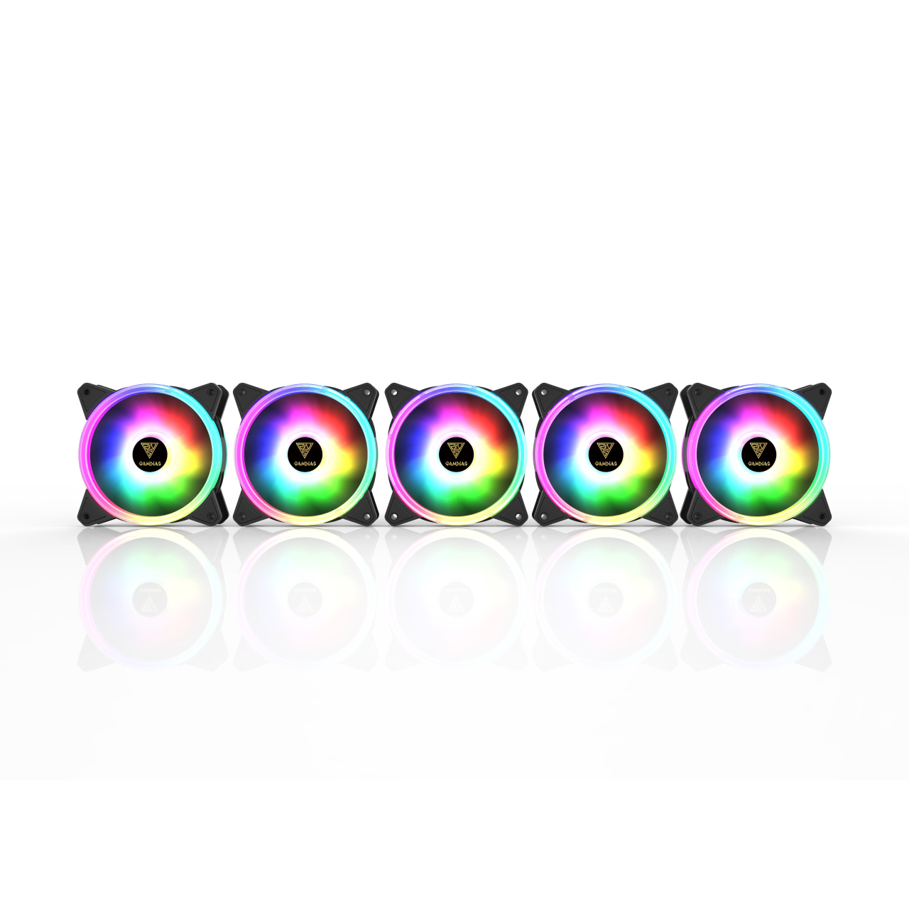 Set 5 ventilatoare Gamdias Aeolus M2 1205R 120mm iluminare RGB, iluminare Ring LED RGB pe ambele fete ale ventilatorului cu 55 de moduri de iluminare, tip rulmet: Rifle Bearing, 600 – 1500 RPM±10%, 56 CFM, 1.95 mmH2O, cablu plat, include telecomanda si hub (suporta pana la 8 ventilatoare si 2 benzi LED), compatibil iesirile de LED adresabil Asus AURA / Gigabyte RGB Fusion / MSI Mystic Light Sync, dimensiuni: 120x120x25mm