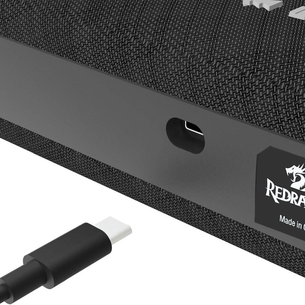 Soundbar Bluetooth Redragon Dora negru iluminare RGB, iluminare RGB a soundbar-ului, putere: 10W RMS (5W x 2), dimensiune difuzor: 2”, frecventa: 20Hz~20KHz, ≥65db, conexiuni input: 1x USB / USB Type-C, dimensiuni: 419x76x54mm