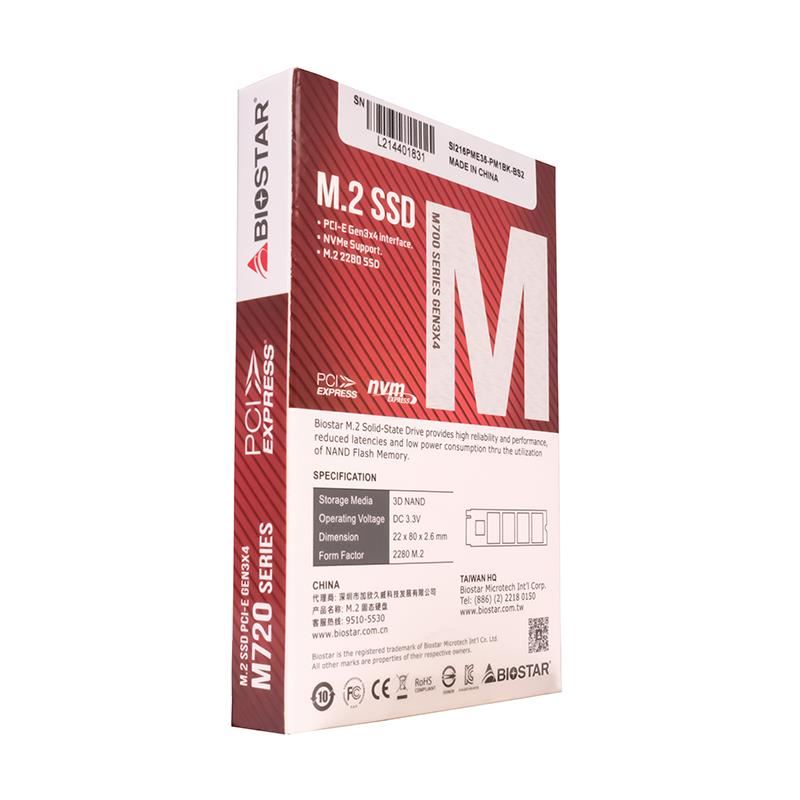 SSD M.2 Biostar M720 512GB Gen3x4, capacitate: 512GB, conexiune M.2 NVMe v1.3, form factor: 2280 M.2, PCI-Express Gen3x4, End-to-End data protection, suporta criptare AES256, viteza de scriere: 1800MB/s (max), viteza de citire: 3450 MB/s (max), dimesiuni: 22 x 80 x 3.5 mm