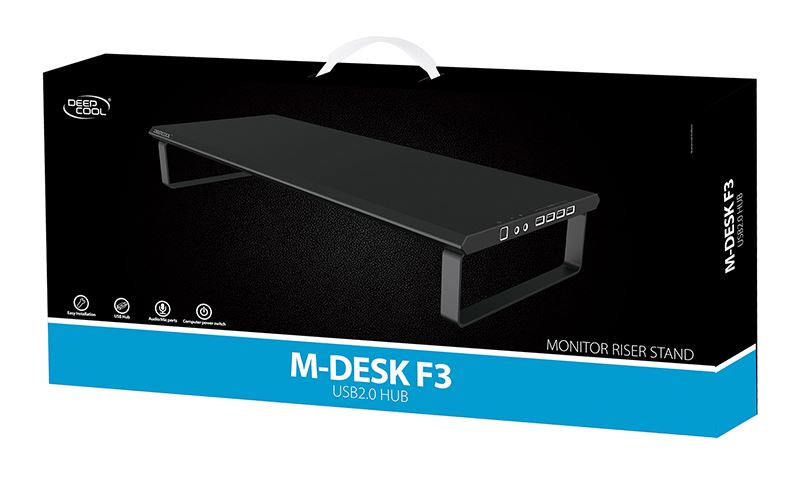 Stand monitor Deepcool M-DESK F3 negru, structura din SPCC, dimensiune monitor: 27” / 25kg (maxim), picioare din aluminiu detasabile, inaltime stand 95mm, 4x USB 2.0, 2x Audio, 1x buton Power(include cablu, splitter si slot PCI pentru unitate desktop), dimensiuni: 584x250x95 mm, greutate: 1941 g