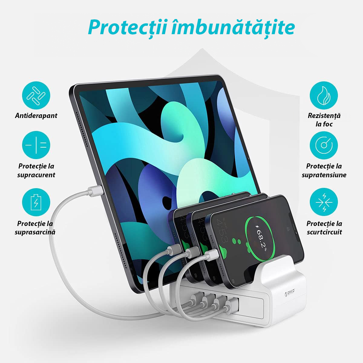 Statie incarcare Orico DUK-4P alba, stand si incarcator cu 4 port-uri USB pentru diverse dispozitive (tablete, telefoane mobile, etc.), foloseste circuit inteligent de detectare a curentului corespunzator aparatului conectat (Intelligent Identification IC), iesiri: 5V2.4A 12W MAX, putere maxima: 30W, protectii: short circuit / over current / over voltage / leakage protection, dimensiuni: 126x79x65mm