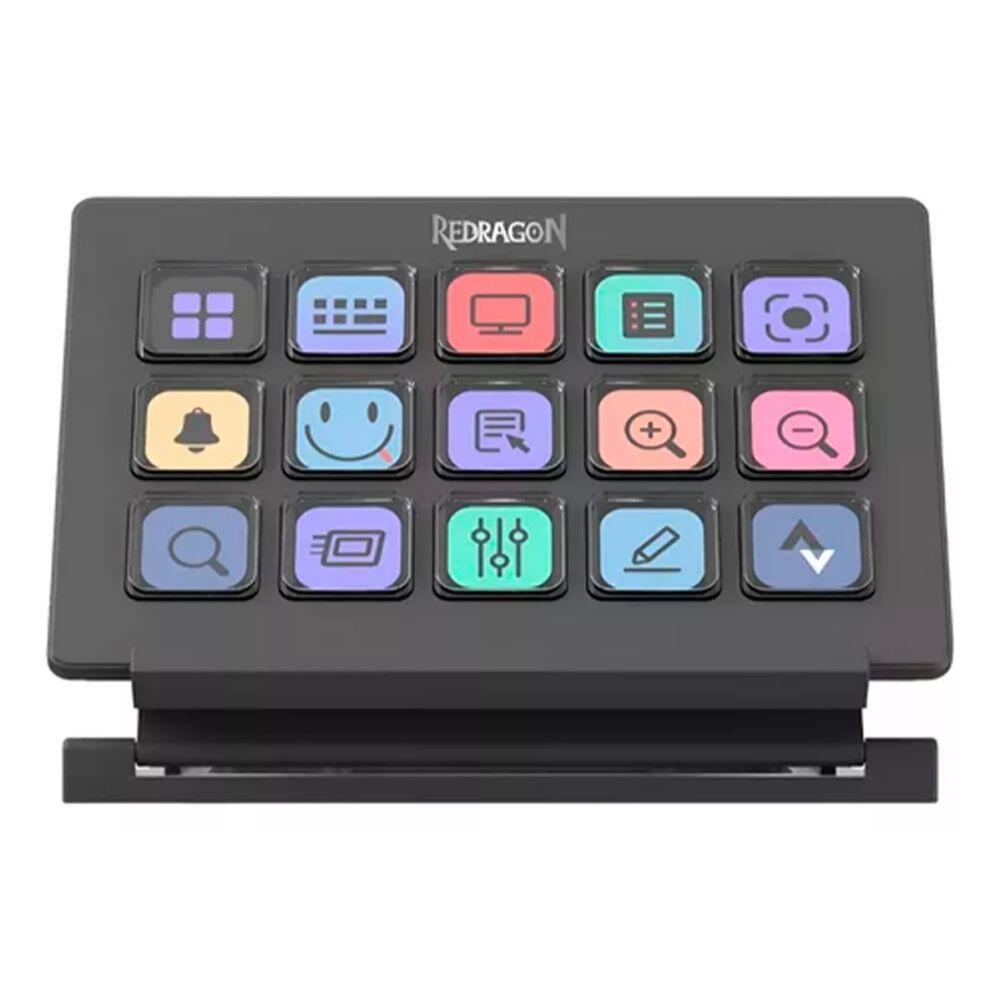 Stream station Redragon Streamcraft negru, constructie: ABS si aluminiu, suport, 15 taste MACRO LCD programabile, suporta 6 profiluri, fiecare buton poate avea pictograme personalizabile, aplicatie pentru configurare, plug-in-uri descarcabile pentru diverse aplicatii (Photoshop, Premiere Pro, After Effects, Blender, Twitch, etc), suport, sisteme de operare compatibile: Windows, conector: USB, dimensiuni: 133x92x21mm, greutate: 267g