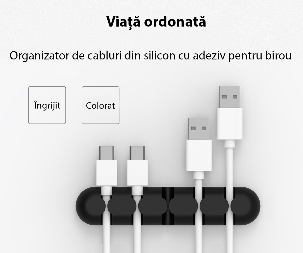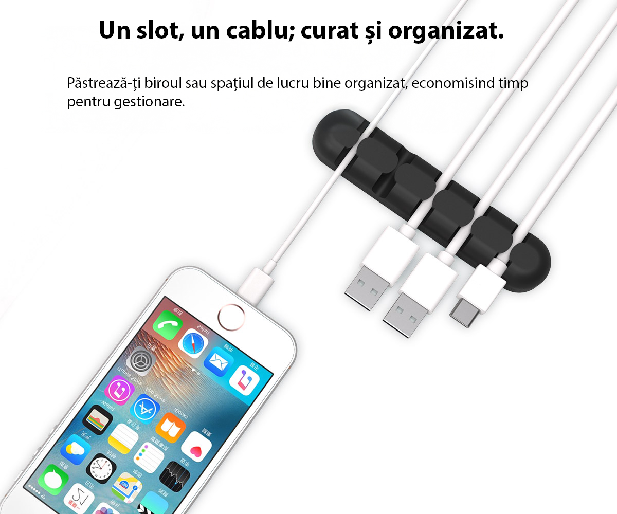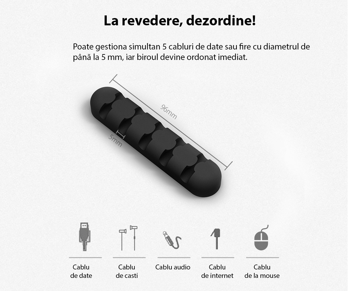 Suport cabluri Orico CBS5 negru, material: silicon, banda adeziva aplicata, cabluri compatibile: grosime sub 5mm, 5 locasuri, dimensiuni: 96x20x12mm