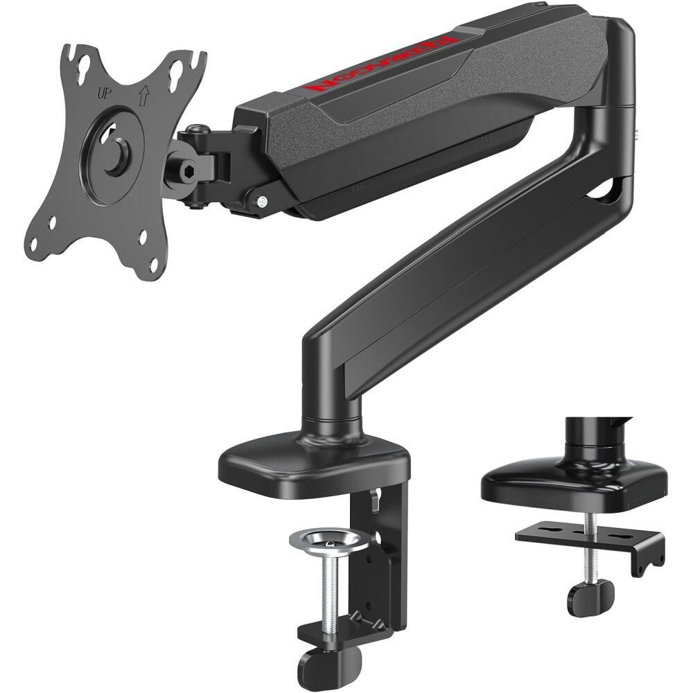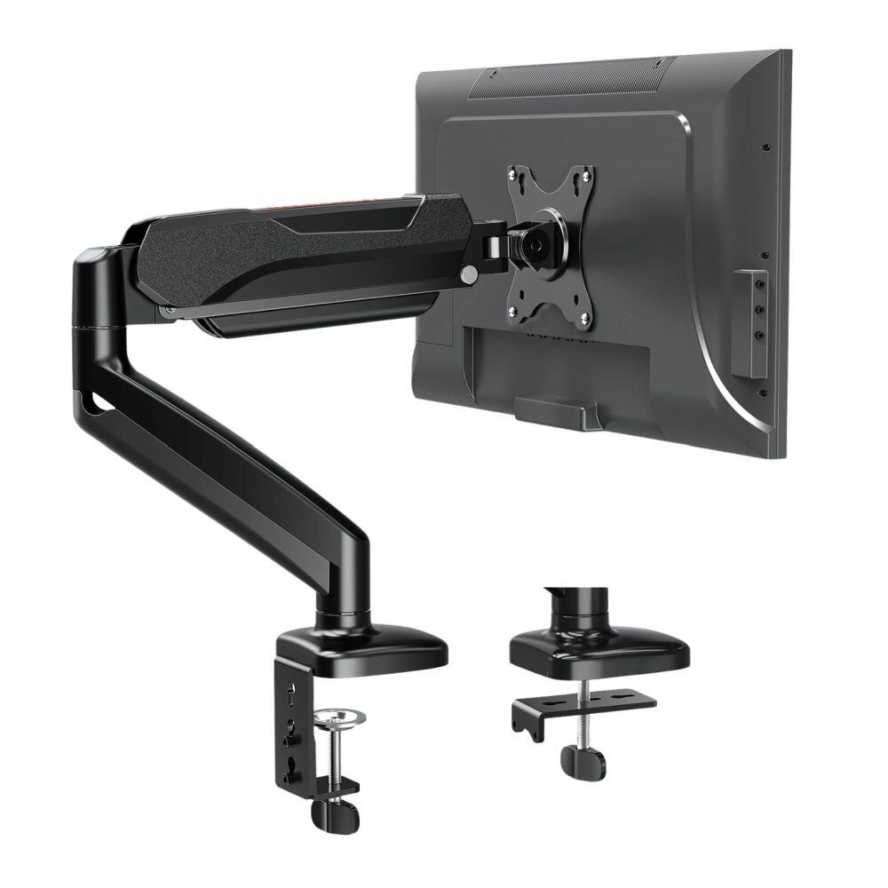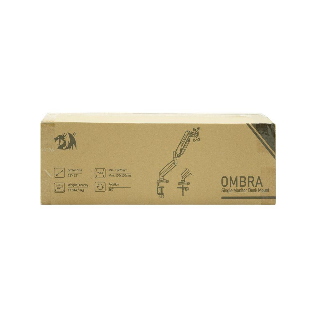 Suport monitor pentru birou Redragon Ombra negru, compatibilitate diagonala: 13 – 32 inch, greutate maxima suportata: 2 – 8kg, compatibilitate VESA: 75x75 / 100x100, amortizor pe gaz pentru reglarea bratului pe inaltime, ajustare monitor: tilt up 90°, tilt down 45°, pivotare in spatele monitorului: 180°, pivotare brat si baza: 360°, 2 sisteme de prindere pentru birou, tip menghina pentru grosimi ale blatului intre 1-6 cm si tip C-clamp pentru grosimi ale blatului intre 1-11.5cm