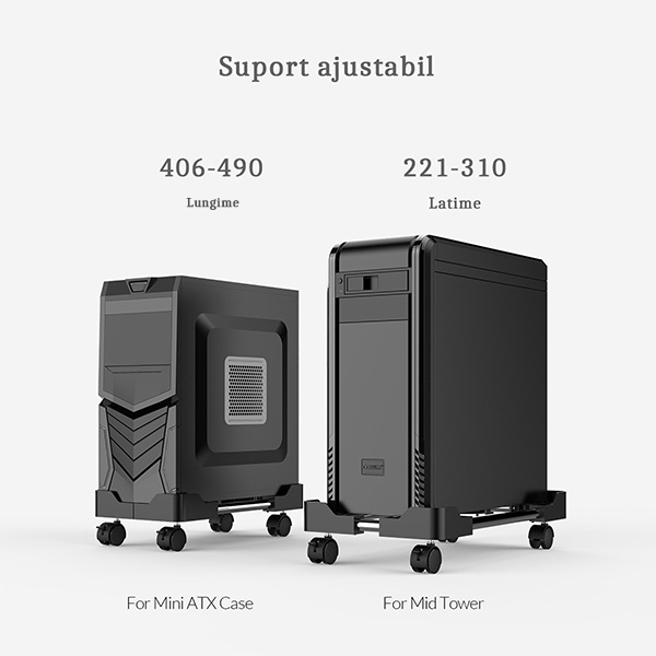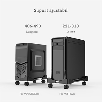 Suport unitate PC cu roti Orico CPB4 reglabil negru, material: ABS, rezistenta la apa si pete, rezista la temperaturi inalte, rotile au sistem de blocare pentru a preveni deplasarea accidentala, structura este reglabila pe latime (221-310mm) si lungime (406-490mm), dimensiuni: 406-490x221-310x50mm, greutate: 0.8kg