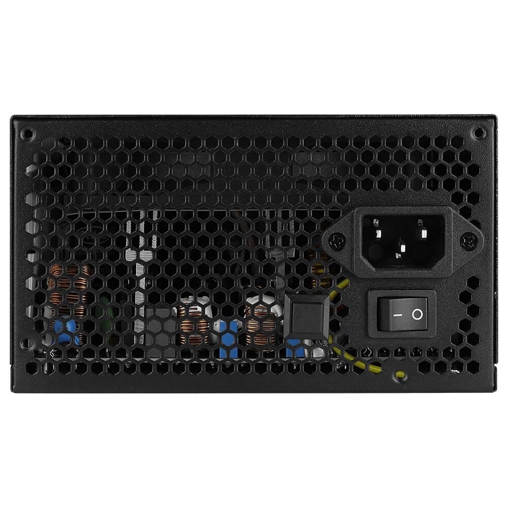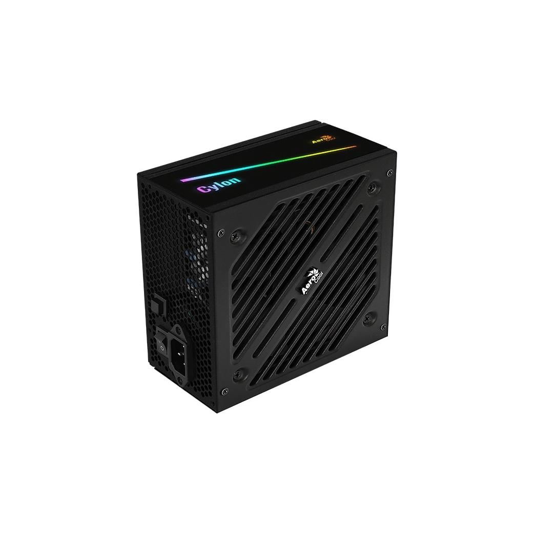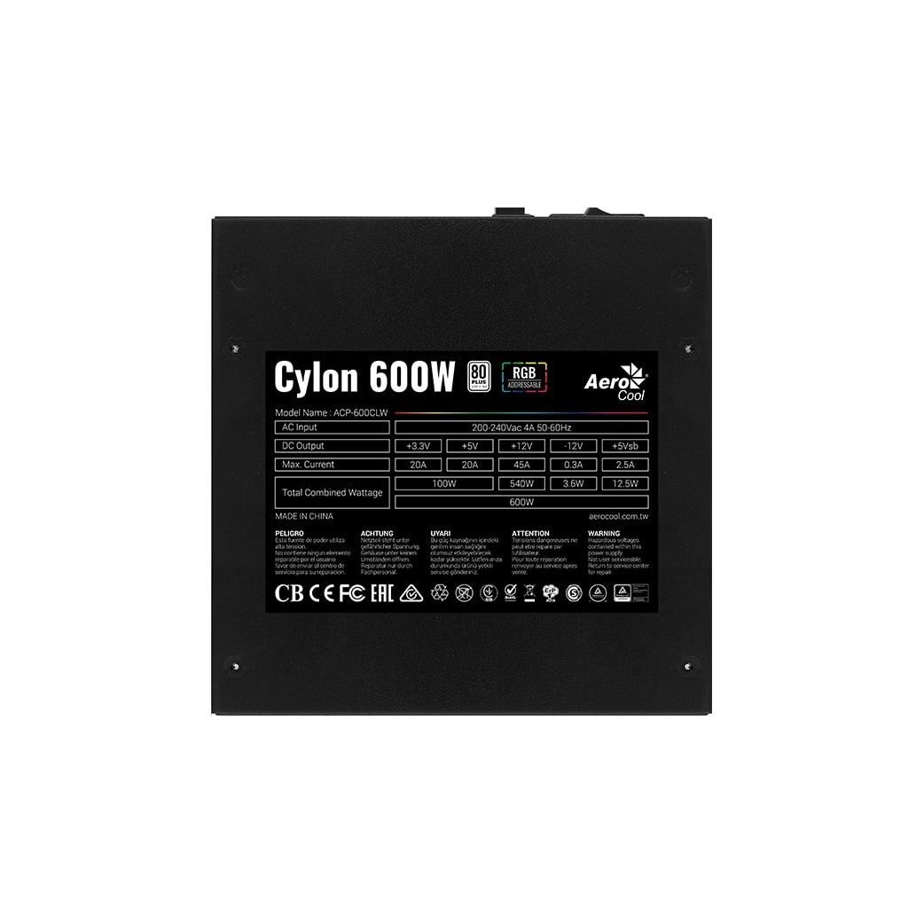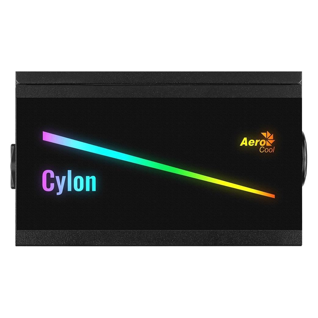Sursa Aerocool Cylon 600W iluminare RGB, certificata 80 Plus, eficienta 85%, single rail (45A), ventilator silentios de 120mm cu iluminare RGB cu control termic automat, 2x 6+2pin PCIE, 5x SATA, 3x Molex, 1x Floppy, 1x 4+4pin EPS12V (lungime 550mm), 1x 24pin (lungime 500mm), protectii OPP/OVP/UVP/SCP/SIP, Active PFC, ATX 12V v2.4