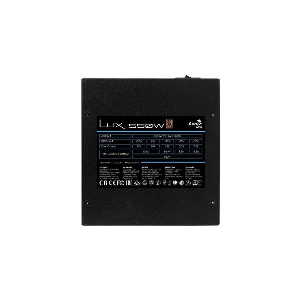 Sursa Aerocool Lux 550W, certificata 80 PLUS Bronze eficienta 88%, single rail (42A), ventilator silentios de 120mm cu control termic automat, 1x 6+2pin PCIE, 4x SATA, 2x Molex, 1x 4+4pin EPS12V (lungime 550mm), 1x 24pin (lungime 500mm), protectii OPP/OVP/UVP/SCP/SIP, Active PFC, ATX 12V v2.4