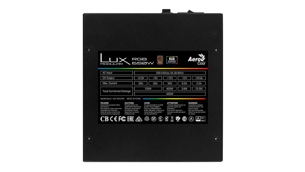 Sursa Aerocool Lux RGB 650 650W iluminare RGB, certificata 80 PLUS Bronze eficienta 88%, iluminare RGB, single rail (50A), ventilator silentios de 120mm cu control termic automat, 2x 6+2pin PCIE, 5x SATA, 3x Molex, 1x 4+4pin EPS12V (lungime 550mm), 1x 24pin (lungime 500mm), protectii OPP/OVP/UVP/SCP/SIP, Active PFC, ATX 12V v2.4