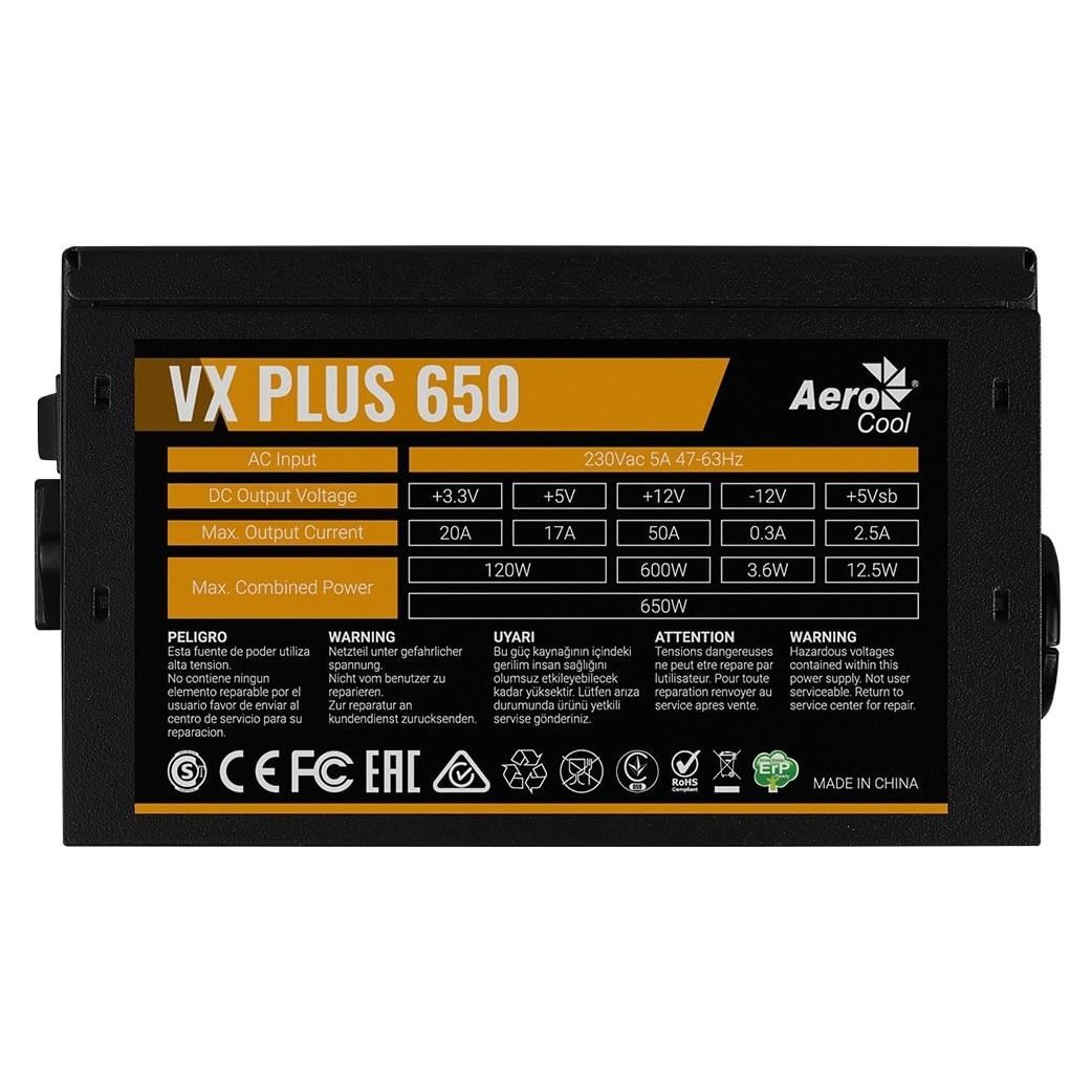 Sursa Aerocool VX Plus 650 650W, eficienta 82%, single rail (50A), ventilator silentios de 120mm cu control termic automat, 2x 6+2pin PCIE, 4x SATA, 3x Molex, 1x Floppy, 1x 4+4pin EPS12V (lungime 550mm), 1x 24pin (lungime 500mm), protectii OPP/OVP/UVP/SCP/SIP, Active PFC, ATX 12V v2.3