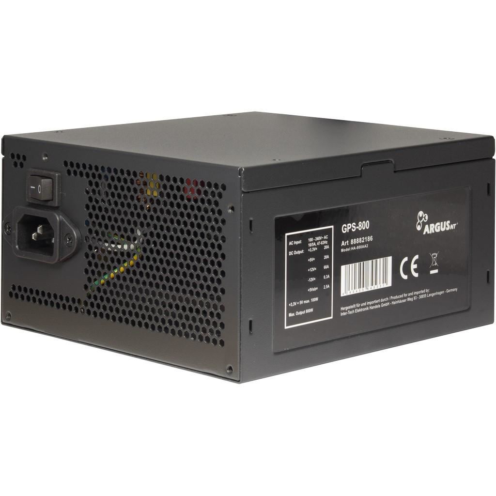 Sursa ArgusNT GPS-800 800W, certificata 80 PLUS GOLD, eficienta max. 93%, single rail (66A), ventilator silentios de 140mm cu control termic automat, 1x 20+4 pin (500mm), 4x 6+2pin PCIE, 6x SATA, 3x Molex, 2x 4+4pin EPS12V (500mm), 1x Floppy, OPP/SCP/OVP/OCP/NLP, Active PFC, ATX 2.4, dimensiuni (WxHxD): 160x86x150mm