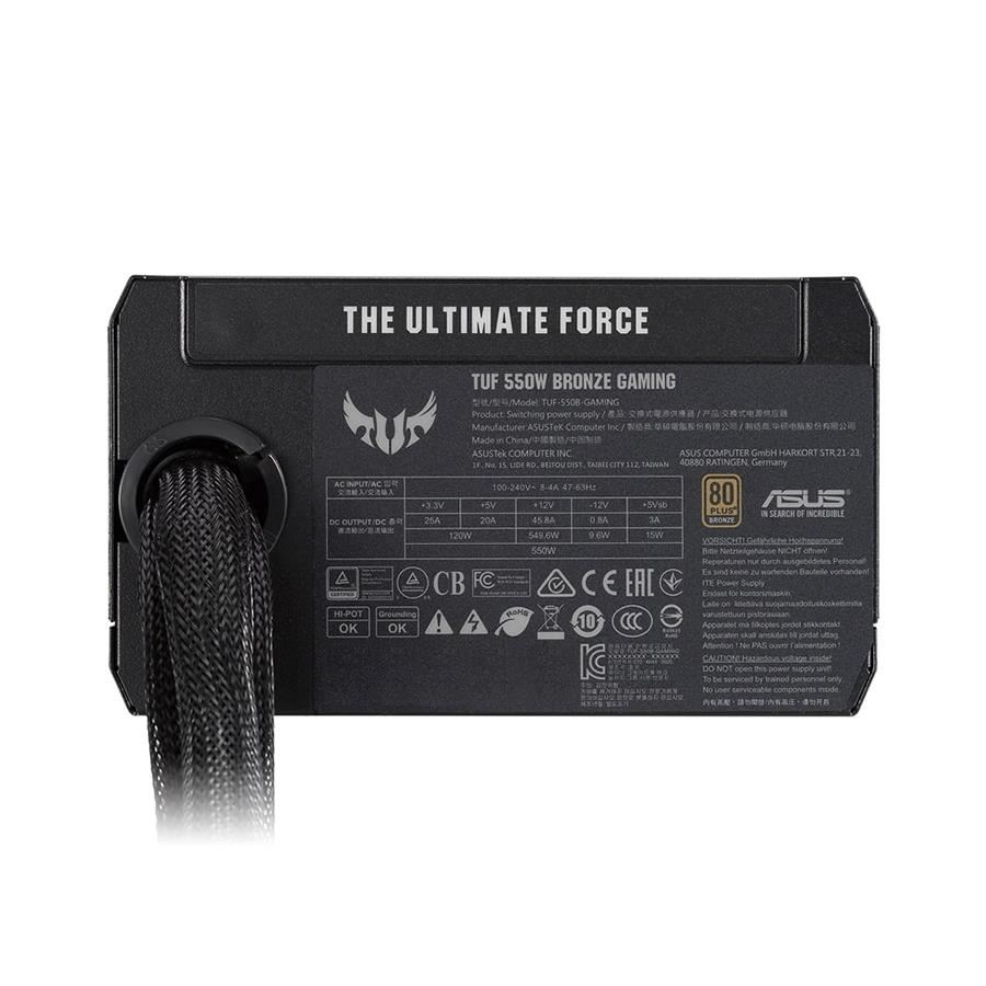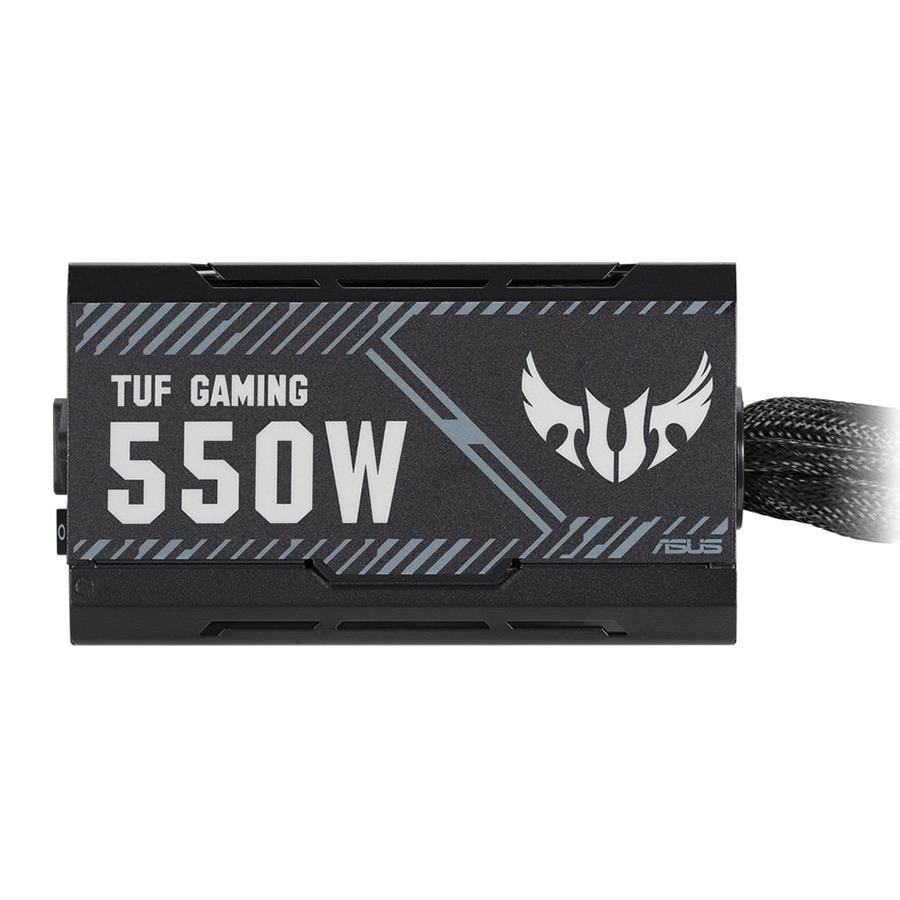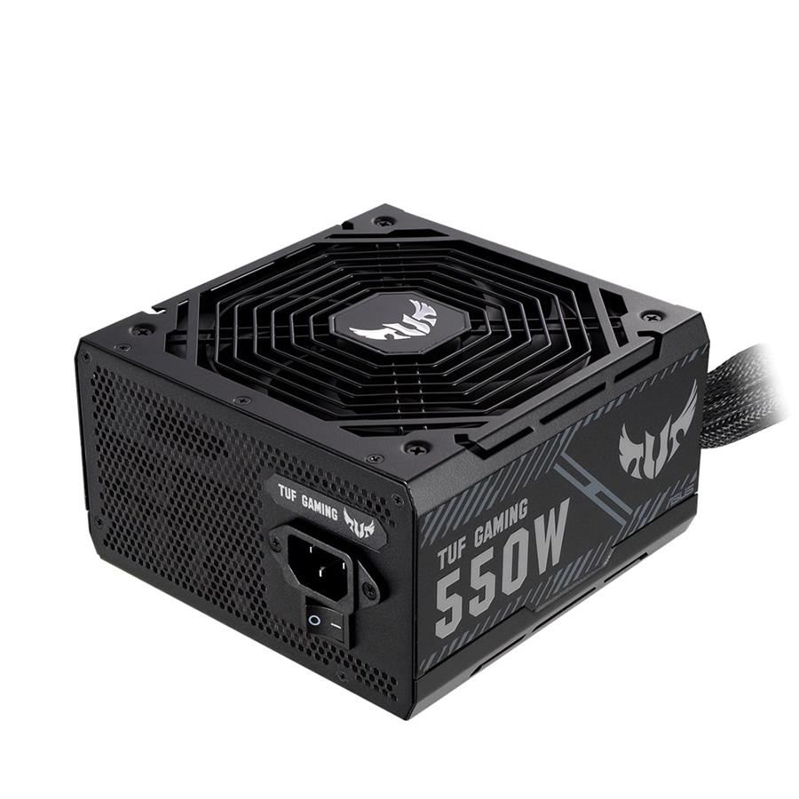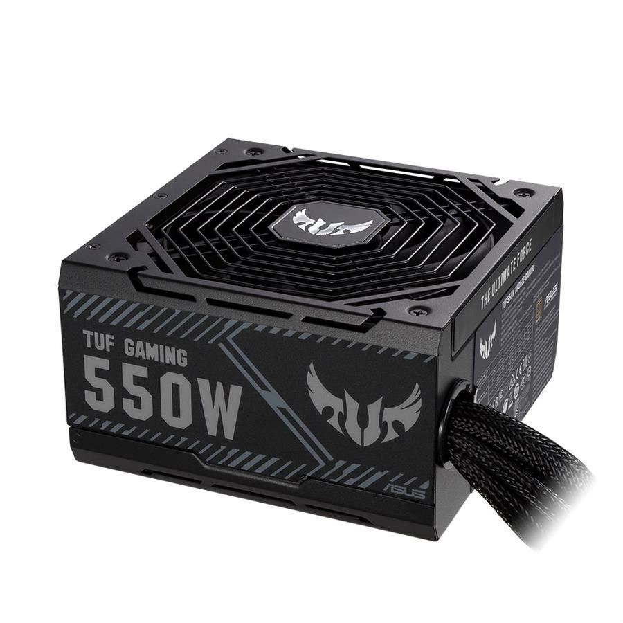 Sursa Asus TUF Gaming 550W Bronze neagra, certificata 80 PLUS Bronze, single rail (45.8A), ventilator silentios de 135mm cu control termic automat (pana la o incarcare de 40% ventilatorul este oprit), 2x 6+2pin PCIE, 5x SATA, 4x Molex, 1x 4+4pin EPS12V (lungime 800mm), 1x 24pin, protectii OPP/OVP/UVP/SCP/OCP/OTP, Active PFC, ATX 12V, dimensiuni: 150x150x86mm