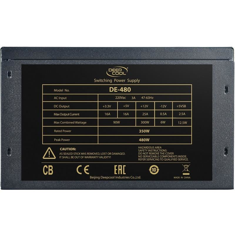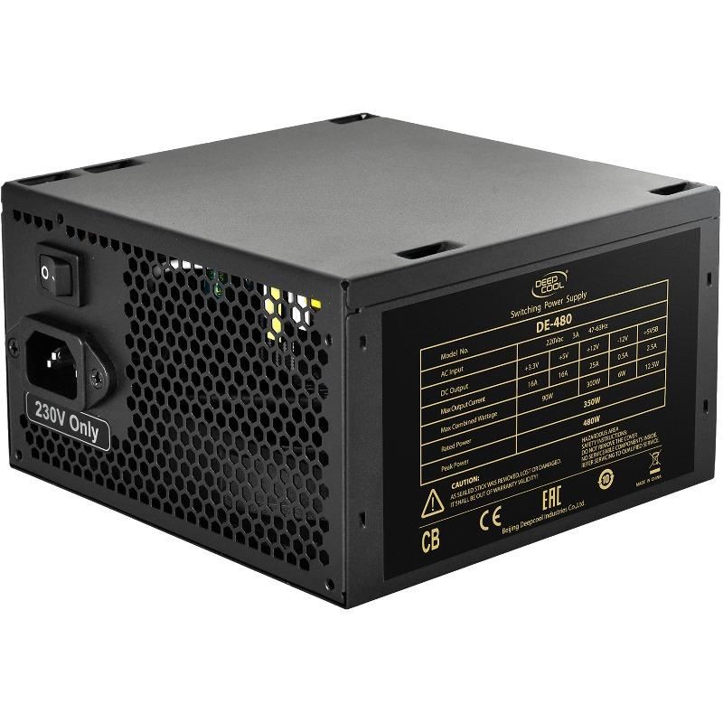Deepcool DE480 480W Black PSU, 480W max load, single rail (25A), ventilator silentios de 120mm cu control termic automat, 1x 6+2pin PCIE, 3x SATA, 3x Molex, protectii OVP/UVP/SCP/OPP, ATX 12V v2.31, dimensiuni (WxLxH): 150x140x86mm