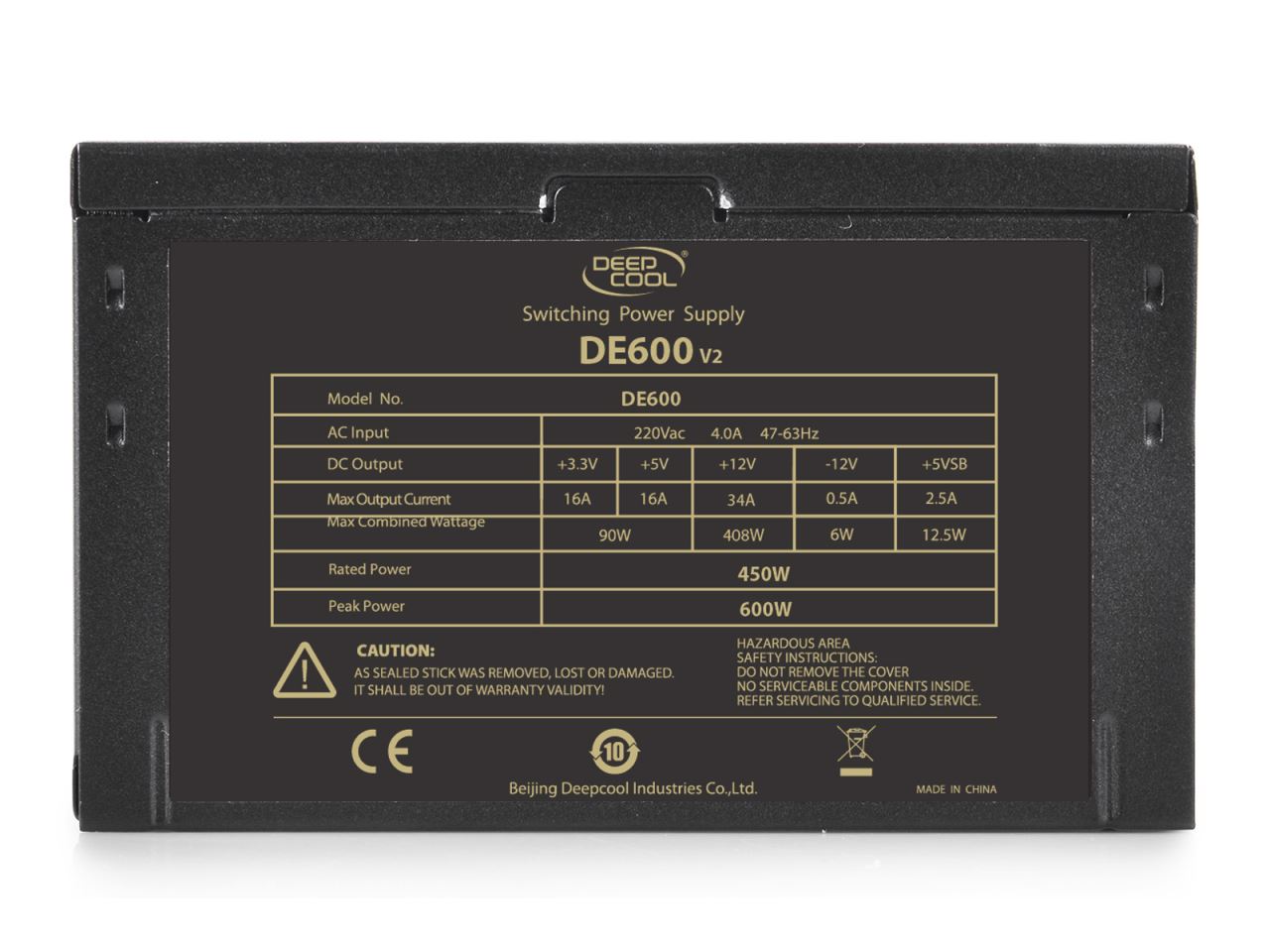 Sursa Deepcool DE600 V2, 450W output, single rail (34A), ventilator silentios de 120mm cu control termic automat, 1x 6+2pin PCIE, 4x SATA, 3x Molex, 1x EPS 4+4pin(600mm)1x 24pin, protectii OVP / UVP / SCP / OPP, ATX 12V v2.31, dimensiuni (WxLxH): 150x140x86mm