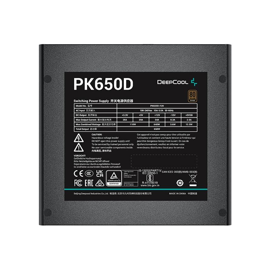 Sursa Deepcool PK650D 650W neagra, certificata 80 PLUS Bronze, eficienta 85%, single rail (54A), ventilator silentios de 120mm cu control termic automat, 1x 24pin (500mm), 4x 6+2pin PCIE, 7x SATA, 4x Molex, 1x 4+4pin EPS12V (620mm), SCP/OPP/OTP/OVP/OCP/UVP, Active PFC, dimensiuni (WxLxH): 150x140x86mm