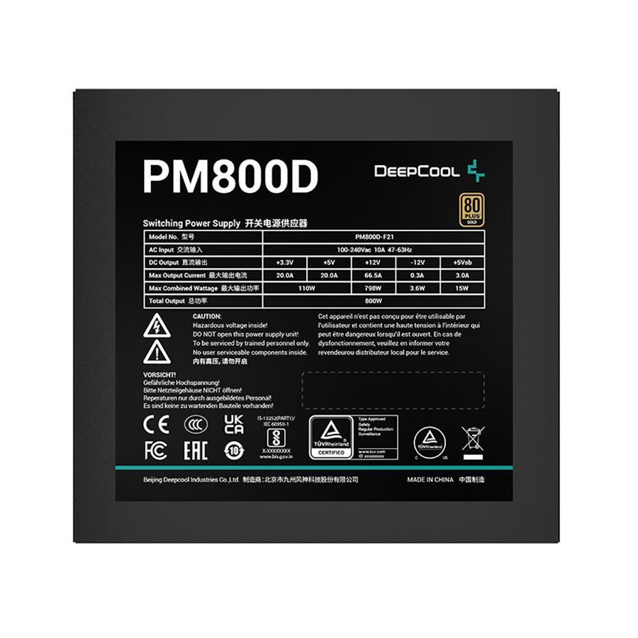 Sursa Deepcool PM800D 800W neagra, certificata 80 PLUS Gold, eficienta 90%, single rail (66.5A), ventilator silentios de 120mm cu control termic automat, 1x 24pin (550mm), 3x 6+2pin PCIE, 6x SATA, 3x Molex, 1x 4+4pin EPS12V (610mm), SCP/OPP/OTP/OVP/OCP/UVP, Active PFC, dimensiuni (WxLxH): 150x140x86mm
