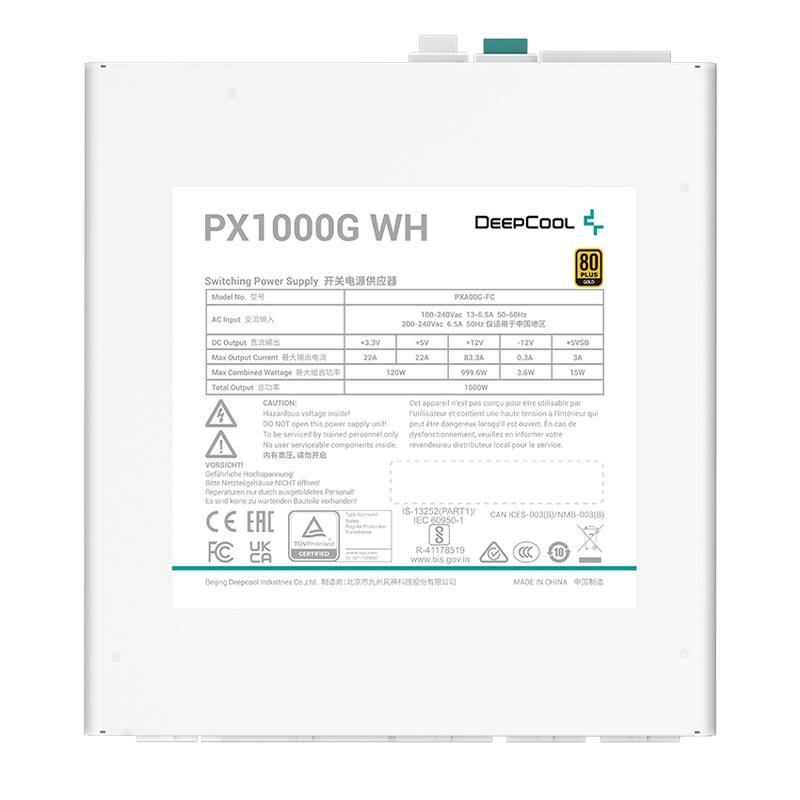 Sursa full modulara Deepcool PX1000G 1000W alba, certificata 80 PLUS Gold, Cybenetics_Platinum, eficienta 90%, ATX12V V3.0, single rail (83.3A), ventilator silentios de 135mm cu control termic automat, 1x 24pin (600mm), 1x 16pin PCIE, 3x 6+2pin PCIE, 8x SATA, 4x Molex, 2x 4+4pin EPS12V (700mm), OPP/OVP/SCP/OTP/OCP/UVP, Active PFC, dimensiuni (WxLxH): 150x160x86mm
