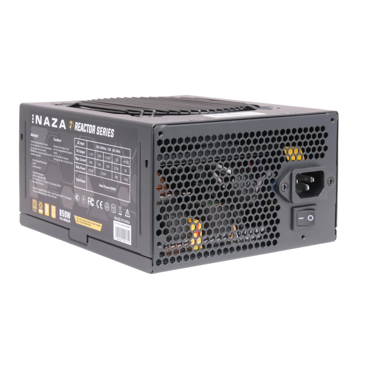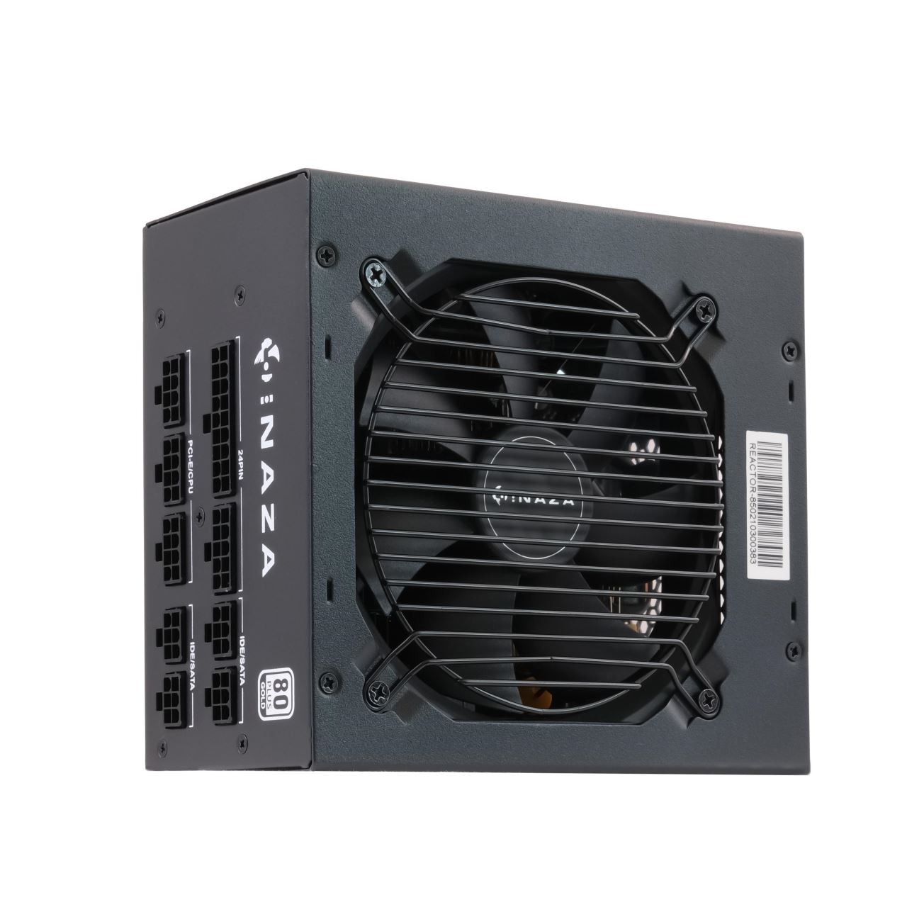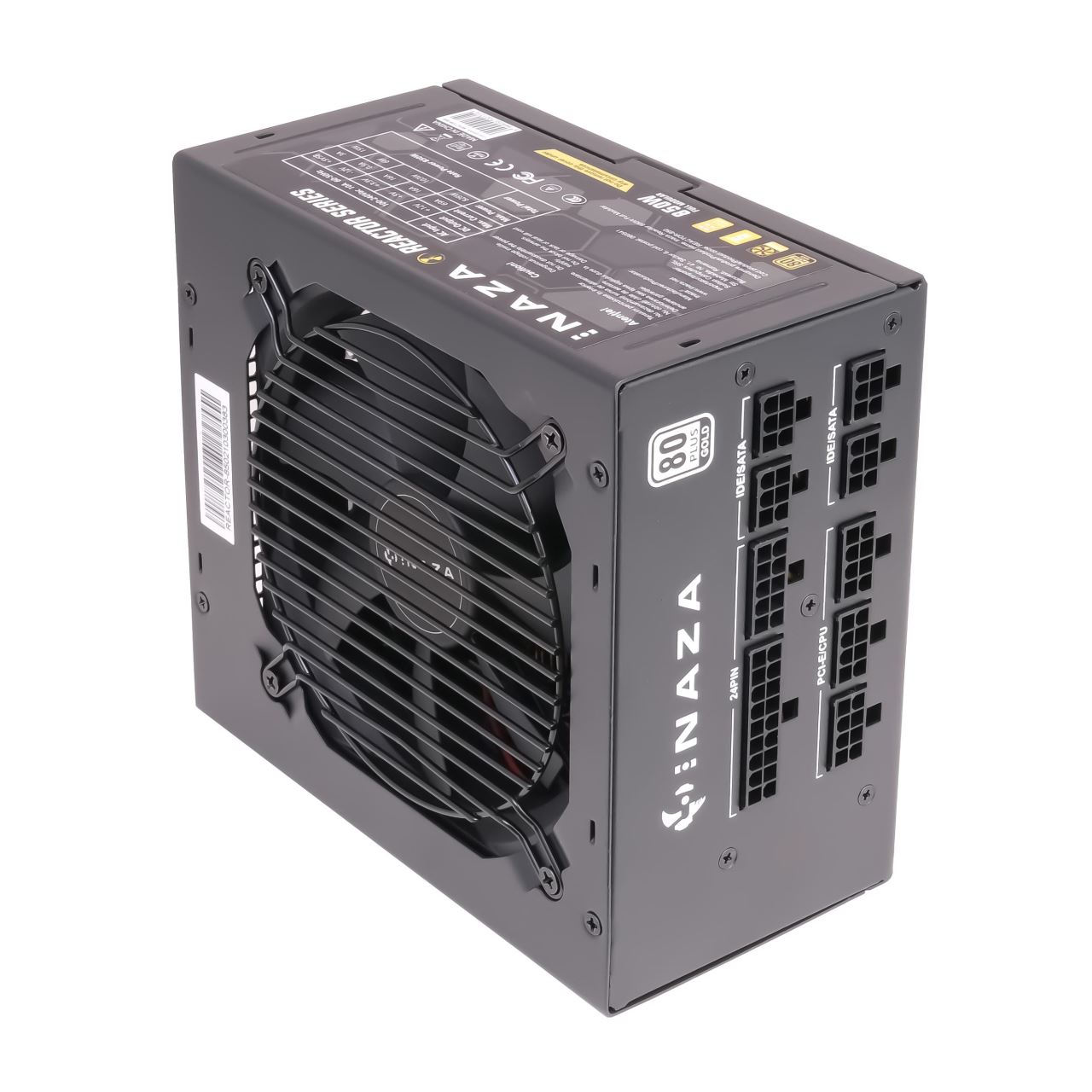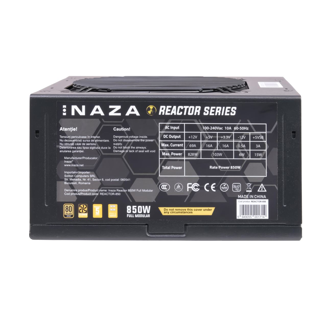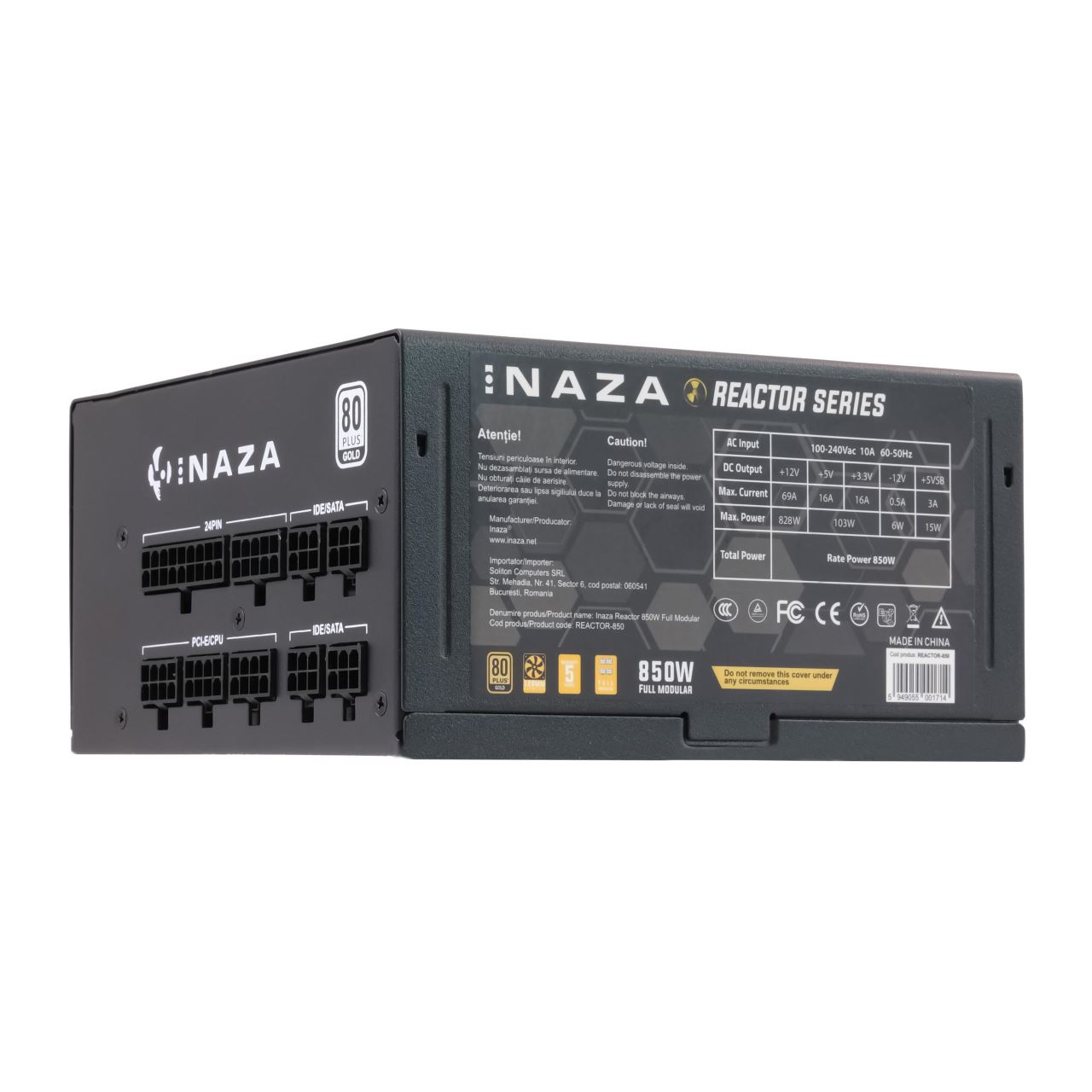 Sursa full modulara Inaza Reactor 850W, 80 PLUS GOLD, eficienta aproximativ 92%, condensatori de capacitate mare la 105° pentru fiabilitate mai mare, single rail (69A), ventilator silentios de 120mm cu control termic automat, cabluri plate pentru un mai bun wire management, 4x 6+2pin PCIE, 8x SATA, 4x Molex, 1x 4+4pin EPS12V(650mm), 1x 24pin(500mm), OVP/SCP/OPP/UVP, Active PFC, ATX 2.31, dimensiuni: 160x150x86mm