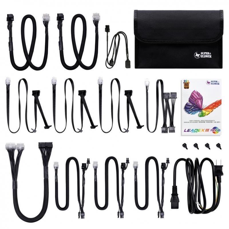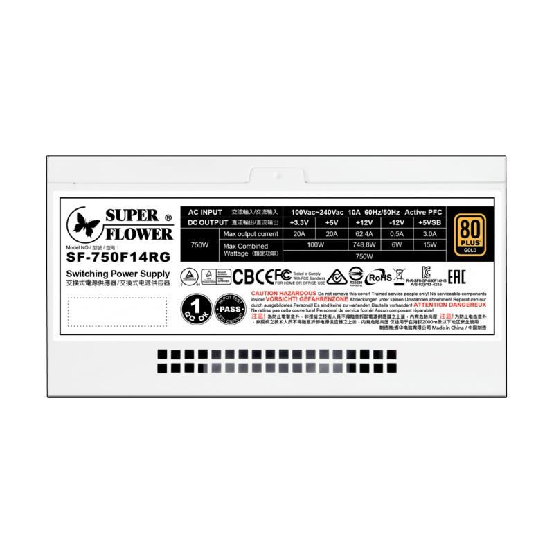 Sursa full modulara Super Flower Leadex III ARGB Gold 750W alba, iluminare aRGB (16 efecte), sincronizare compatibila cu Asus Aura Sync / MSI Mystic Light Sync / Gigabyte RGB Fusion 2.0 / ASRock Polychrome Sync, certificata 80 PLUS Gold, eficienta 92%, cabluri full modulare plate pentru un wire management mai bun, single rail (62.4A), ventilator silentios de 130mm (Fluid Dynamic Bearing) cu tehnologie ECO Intelligent Thermal Control System, condensatori japonezi, 6x 6+2pin PCIE (lungime: 550mm+150mm), 9x SATA, 4x Molex, 2x 4+4pin EPS12V (lungime: 700mm), 20+4pin (lungime: 600mm), protectii OVP / OCP / OPP / SCP / UVP / OTP, Active PFC, ATX 12V v2.92, EPS 12V v2.92, dimensiuni: 160x150x86mm, certificari: cTÜVus / TÜV / CB / CE / FCC / RCM / BSMI / RoHS/ KCC /CCC