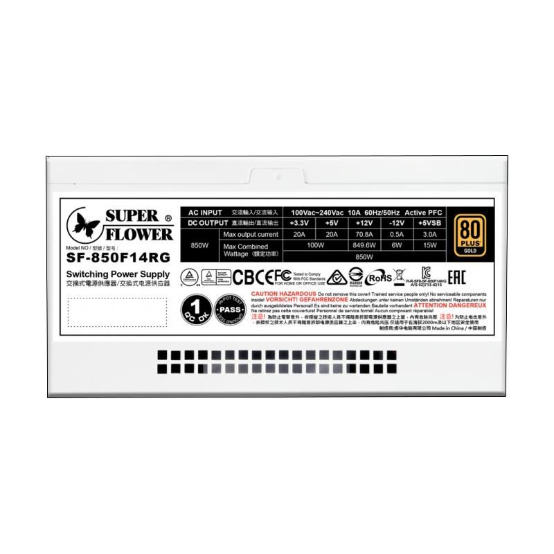 Sursa full modulara Super Flower Leadex III ARGB Gold 850W alba, iluminare aRGB (16 efecte), sincronizare compatibila cu Asus Aura Sync / MSI Mystic Light Sync / Gigabyte RGB Fusion 2.0 / ASRock Polychrome Sync, certificata 80 PLUS Gold, eficienta 92%, cabluri full modulare plate pentru un wire management mai bun, single rail (70.8A), ventilator silentios de 130mm (Fluid Dynamic Bearing) cu tehnologie ECO Intelligent Thermal Control System, condensatori japonezi, 6x 6+2pin PCIE (lungime: 550mm+150mm), 9x SATA, 4x Molex, 2x 4+4pin EPS12V (lungime: 700mm), 20+4pin (lungime: 600mm), protectii OVP / OCP / OPP / SCP / UVP / OTP, Active PFC, ATX 12V v2.92, EPS 12V v2.92, dimensiuni: 160x150x86mm, certificari: cTÜVus / TÜV / CB / CE / FCC / RCM / BSMI / RoHS/ KCC /CCC