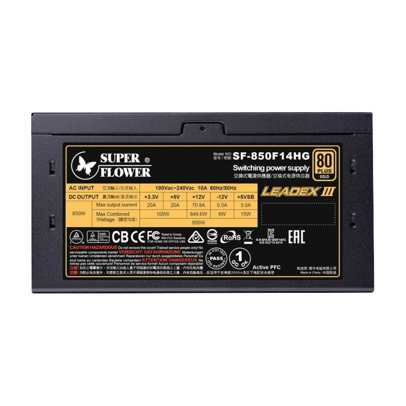 Sursa full modulara Super Flower Leadex III Gold 850W, certificata 80 PLUS Gold, eficienta 92%, cabluri full modulare plate pentru un wire management mai bun, single rail (70.8A), ventilator silentios de 130mm (Fluid Dynamic Bearing) cu tehnologie ECO Intelligent Thermal Control System, condensatori japonezi, 6x 6+2pin PCIE (lungime: 550mm+150mm), 9x SATA, 4x Molex, 2x 4+4pin EPS12V (lungime: 700mm), 20+4pin (lungime: 600mm), protectii OVP / OCP / Dual OPP / SCP / UVP / OTP, Active PFC, ATX 12V v2.92, EPS 12V v2.92, dimensiuni: 160x150x86mm, certificari: cTÜVus / TÜV / CB / CE / FCC / RCM / BSMI / RoHS / KCC /CCC