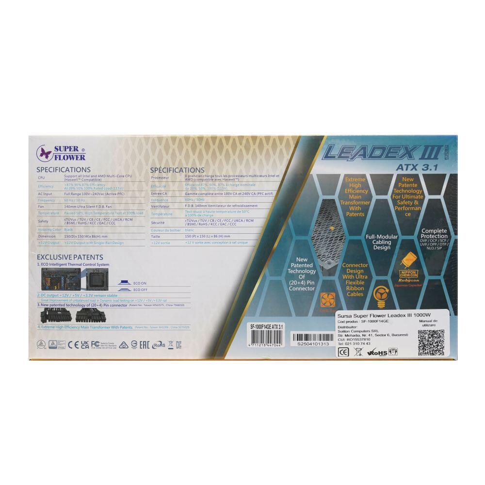 Sursa full modulara Super Flower Leadex III Gold Up ATX 3.1 1000W, certificata 80 PLUS Gold, eficienta 90%, cabluri full modulare pentru un wire management mai bun, single rail (83.3A), ventilator silentios FDB de 140mm cu tehnologie Inteligent heat control, condensatori japonezi (Nippon Chemi-Con), 4x 6+2pin PCIE, 1x PCIE 16pin, 8x SATA, 4x Molex, 2x 4+4pin EPS12V (700mm), 1x 24pin (600mm), protectii OVP/ OCP / OTP/ SCP / UVP / OPP / NLO / SIP, Active PFC, ATX 12V v3.1, SSI EPS 12V v2.92, dimensiuni (LxWxH): 150x150x86mm, certificari: cTÜVus / TÜV / CB / CE / FCC / UKCA / RCM / BSMI / RoHS / KCC / EAC / CCC, greutate: 2.5kg