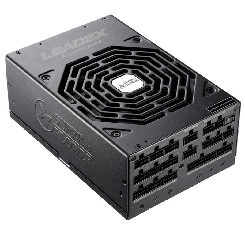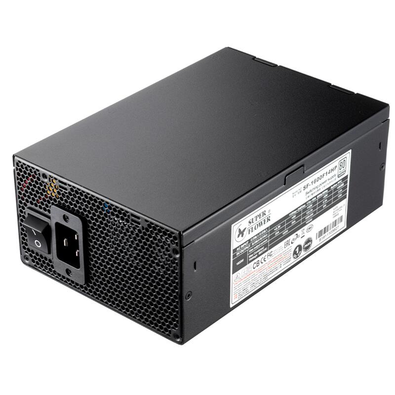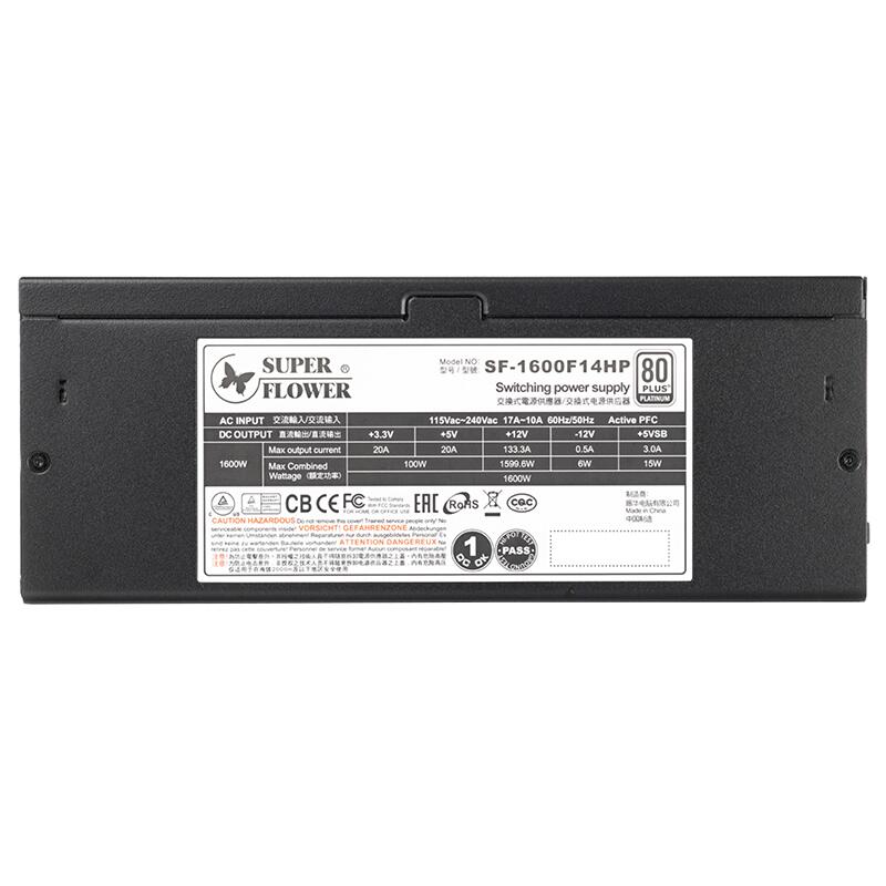 Sursa full modulara Super Flower Leadex Platinum 1600W neagra, certificata 80 PLUS Platinum, eficienta 92%, cabluri imbracate in mesh full modulare pentru un wire management mai bun, single rail (133.3A), ventilator silentios de 140mm (Two-Ball Bearing) cu tehnologie ECO Intelligent Thermal Control System (ventilatorul nu incepe sa se roteasca pana ce temperatura interna a sursei nu atinge 55°C), condensatori japonezi (Nippon Chemi-Con), 9x 6+2pin PCIE, 5x 6pin PCIE, 14x SATA, 5x Molex, 2x 4+4pin EPS12V (lungime: 750mm), 1x 24pin (lungime: 600mm), 1x adaptor MOLEX – Floppy, protectii OVP/OCP/OPP/SCP/UVP, Active PFC, ATX 12V v2.32, SSI EPS 12V v2.92, dimensiuni (LxWxH): 165x150x86mm, certificari: cTUVus / TUV / CB / CE / FCC / C-Tick / BSMI / RoHS / CCC, greutate: 2.7kg