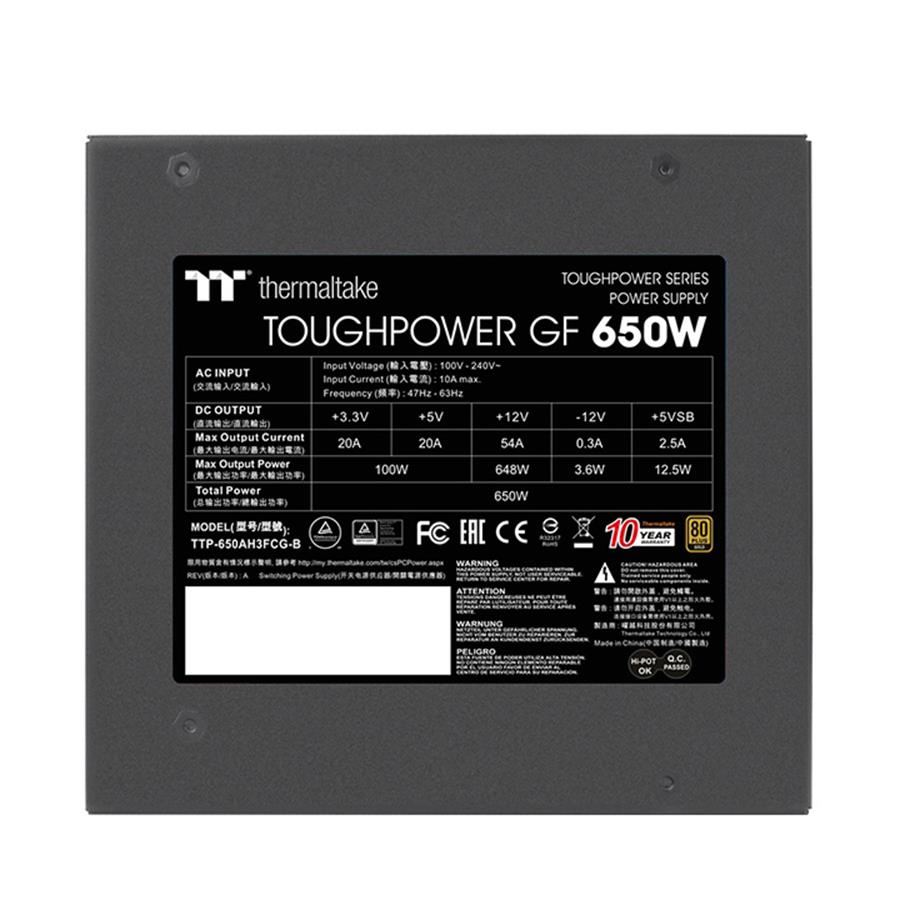 Sursa full modulara Thermaltake Toughpower GF 650W, certificata 80 PLUS Gold, eficienta pana la 90%, single rail (54A), ventilator silentios de 140mm cu control termic automat, 4x 6+2pin PCIE(650mm), 9x SATA, 4x Molex, 1x Floppy(adaptor), 1x 4+4pin EPS12V(650mm), 1x 24pin(600mm), OCP/OVP/UVP/OPP/SCP/OTP, Active PFC, dimensiuni (H x W x D): 86x150x160mm