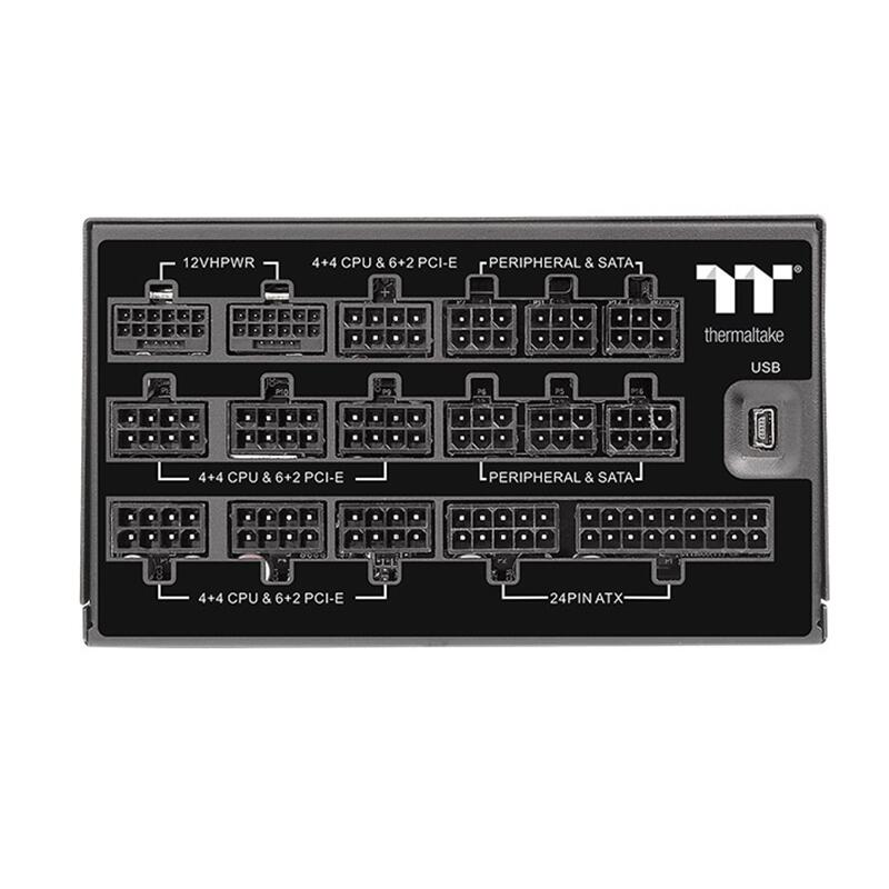 Sursa full modulara Thermaltake Toughpower iRGB PLUS 1650W Titanium iluminare RGB, certificata 80 PLUS Titanium, single rail (137.5A), ventilator silentios de 140mm Riing DUO (16.8 milioane de culori), posibilitatea controlului de la distanta (alerte si oprirea PC-ului), 9x 6+2pin PCIE, 2x 16pin PCIE(600mm), 16x SATA, 8x Molex, 1x Floppy (cu adaptor), 2x 4+4pin ATX 12V (700mm), 1x 24pin(600mm), OCP/OVP/UVP/OPP/OTP/SCP, Active PFC, condensatori Japonezi, dimensiuni (WxHxD): 150x86x180mm