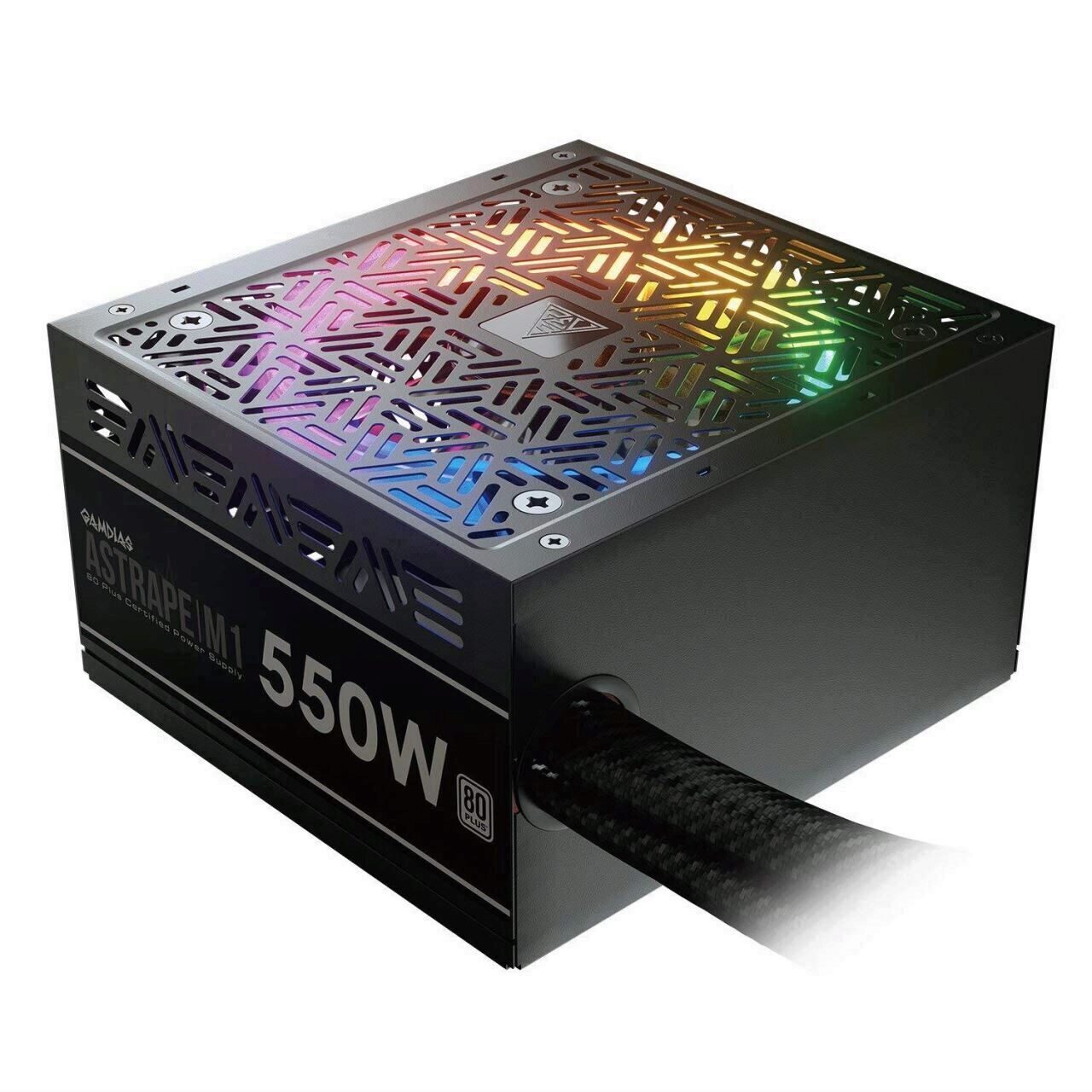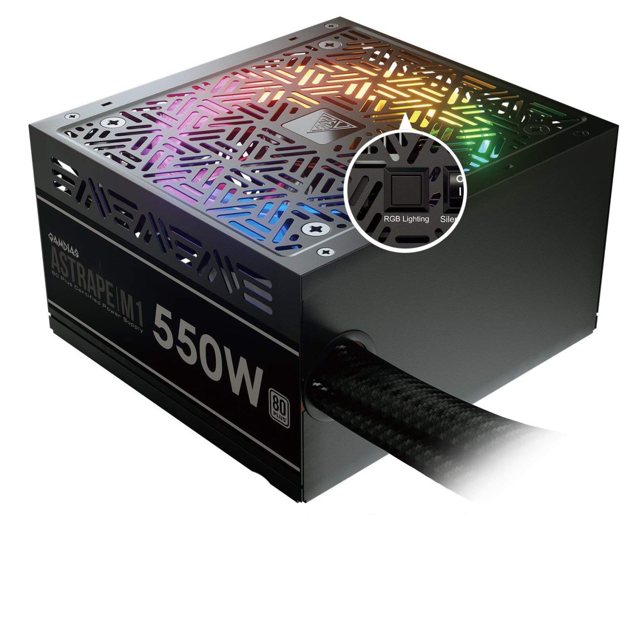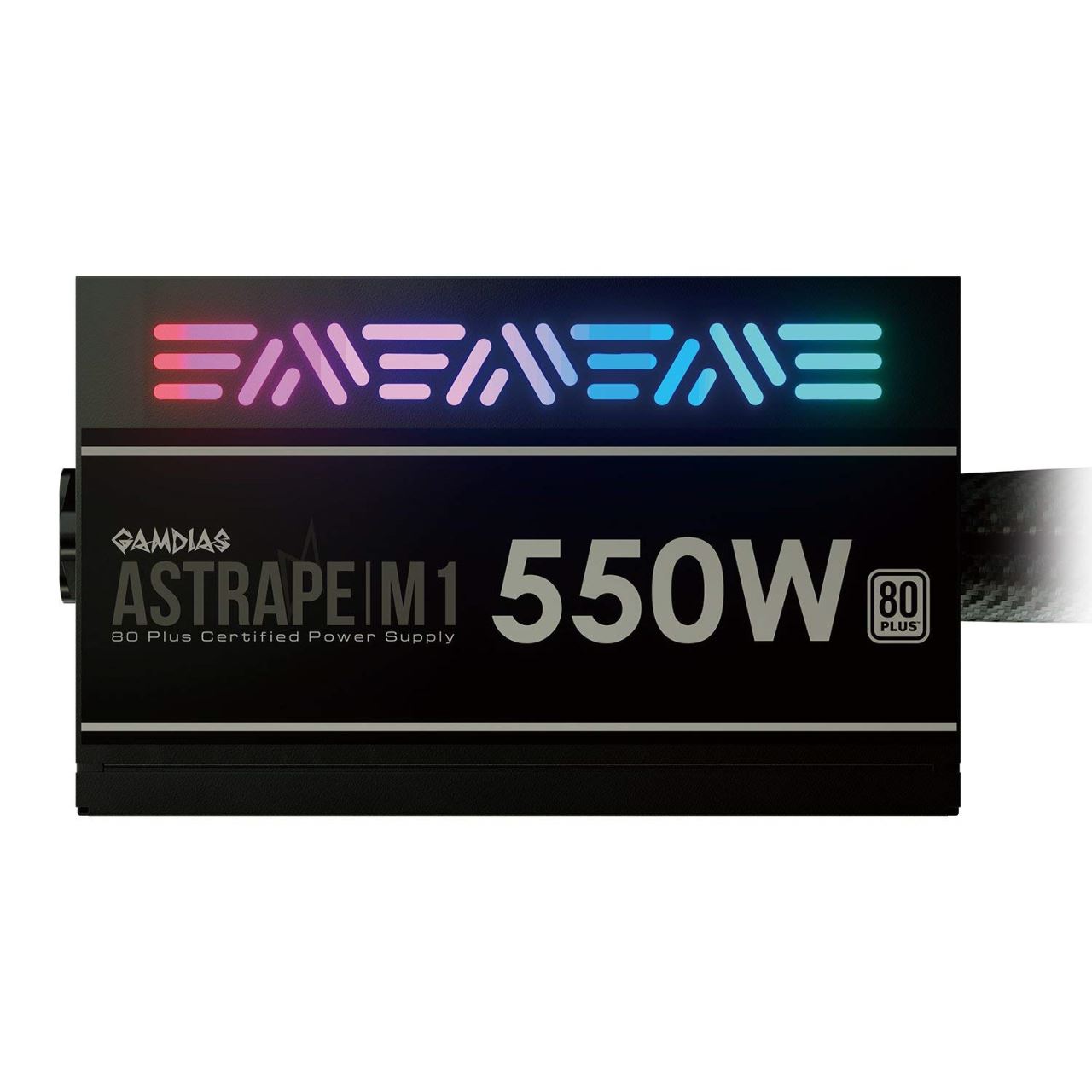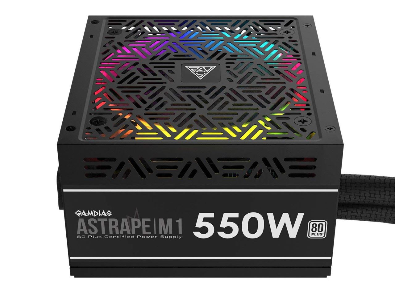 Gamdias Astrape M1 550W PSU, certificata 80 PLUS, eficienta 80%, single rail (43A), ventilator silentios de 120mm cu control termic automat(se poate activa/dezactiva din buton) cu iluminare RGB, 2x 6+2pin PCIE, 5x SATA, 2x Molex, 1x Floppy, 1x 4+4pin EPS12V, 1x 20+4pin, SCP/OVP/OPP/UVP/SP/ICP, Active PFC, dimensiuni: 86mm x 150mm x 140mm