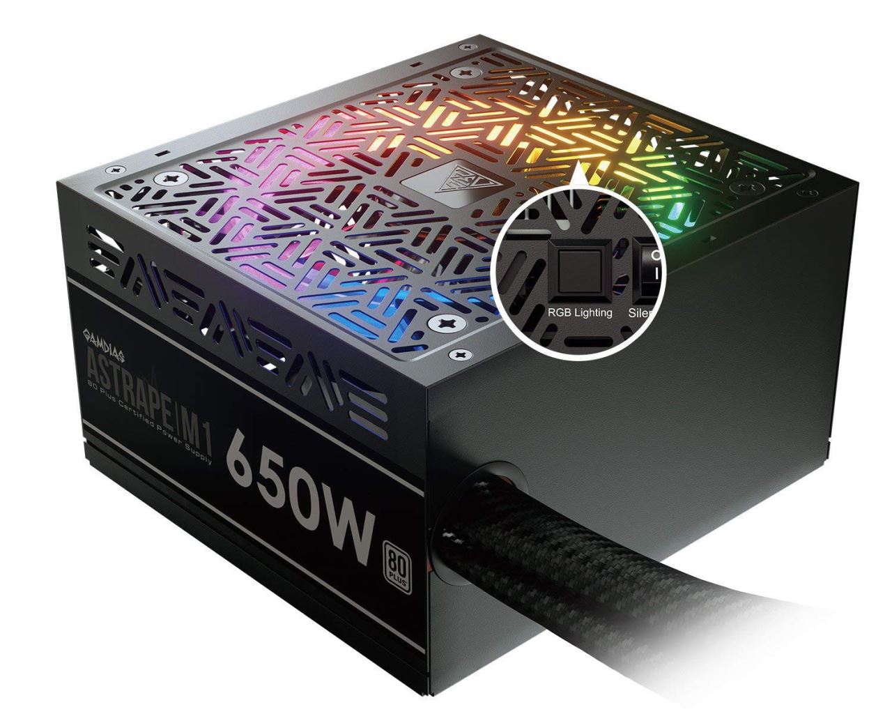 Gamdias Astrape M1 650W PSU, certificata 80 PLUS, eficienta 80%, single rail (52A), ventilator silentios de 120mm cu control termic automat(se poate activa/dezactiva din buton) cu iluminare RGB, 2x 6+2pin PCIE, 5x SATA, 2x Molex, 1x Floppy, 1x 4+4pin EPS12V, 1x 20+4pin, SCP/OVP/OPP/UVP/SP/ICP, Active PFC, dimensiuni: 86mm x 150mm x 140mm