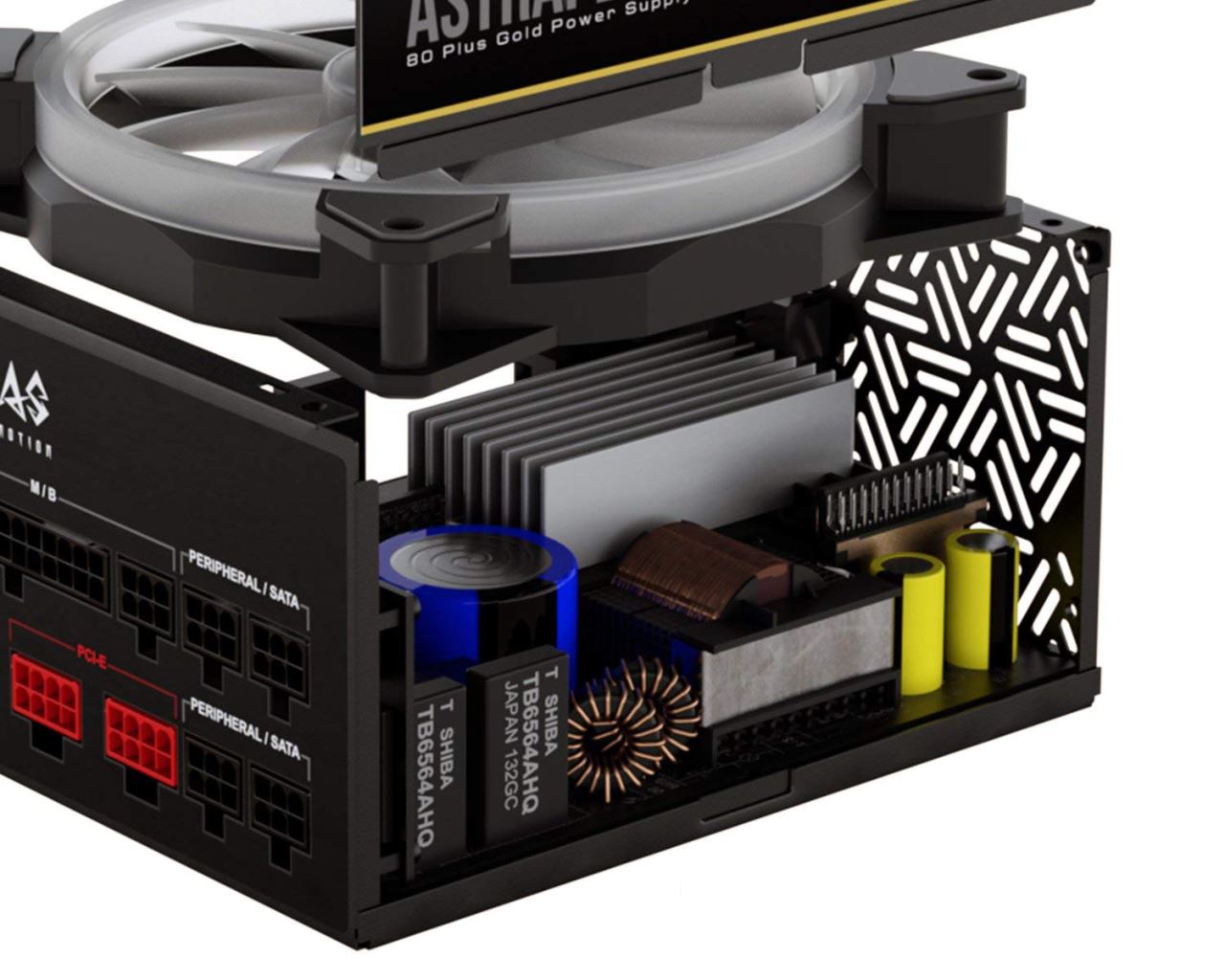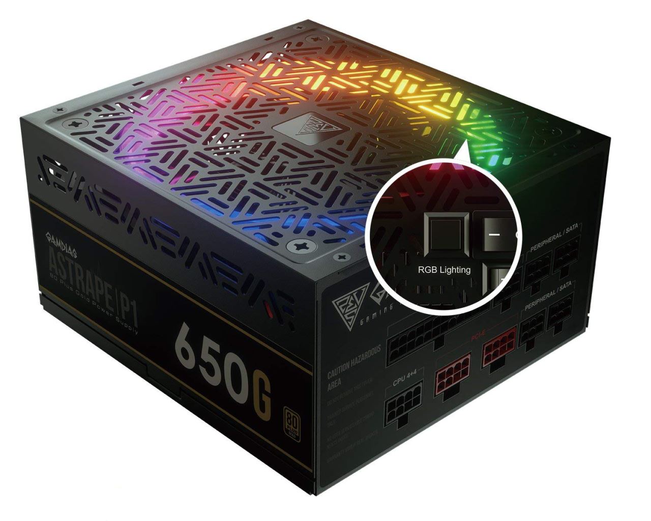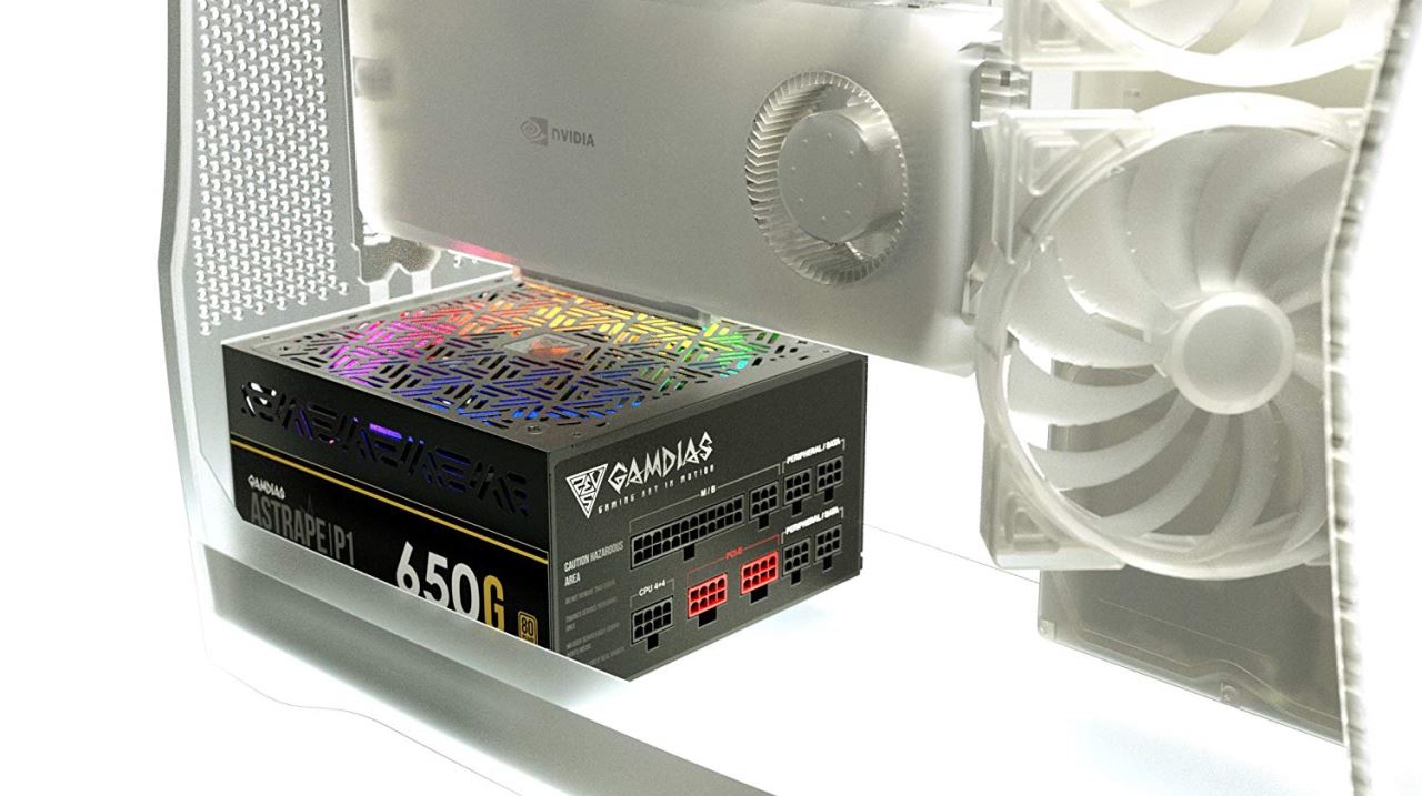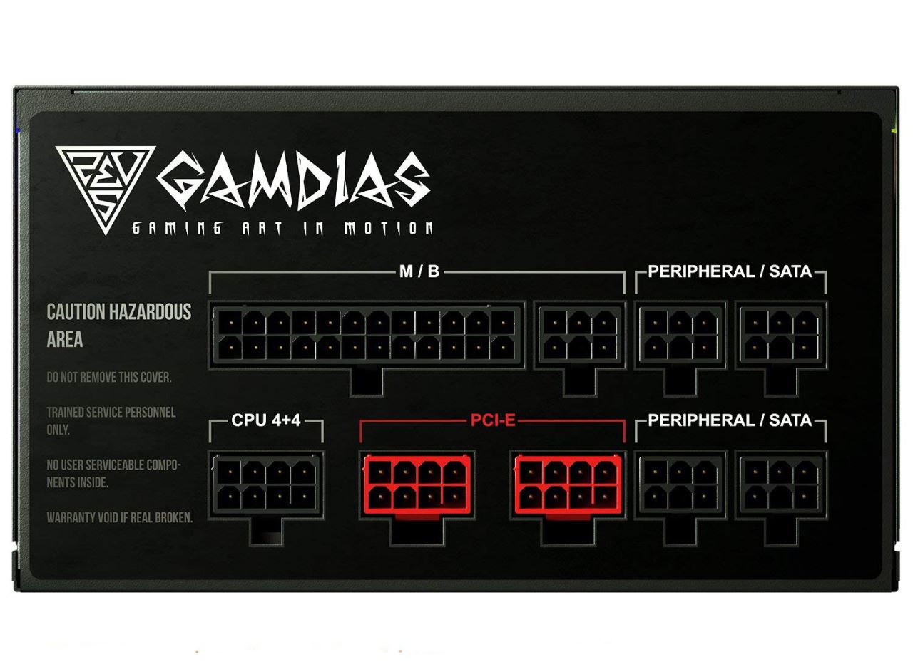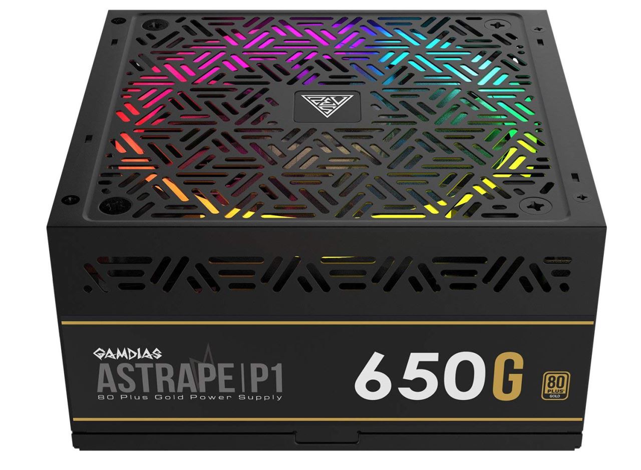 Gamdias Astrape P1 Gold 650W PSU, certificata 80 PLUS, eficienta 90%, single rail (54.2A), ventilator silentios de 120mm cu control termic automat(se poate activa/dezactiva din buton) cu iluminare RGB, 4x 6+2pin PCIE, 9x SATA, 3x Molex, 1x Floppy, 1x 4+4pin EPS12V, 1x 20+4pin, OVP/UVP/OPP/OCP/SCP/SP/ICP, ATX12V v2.4, Active PFC, dimensiuni: 86mm x 150mm x 140mm