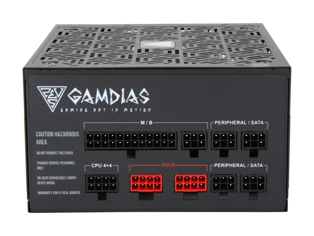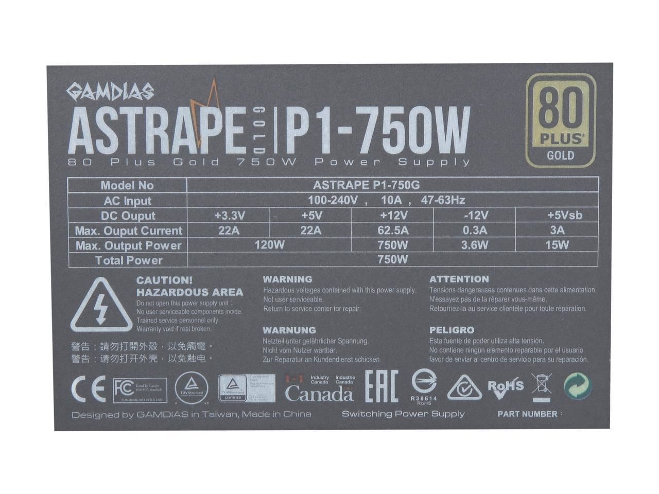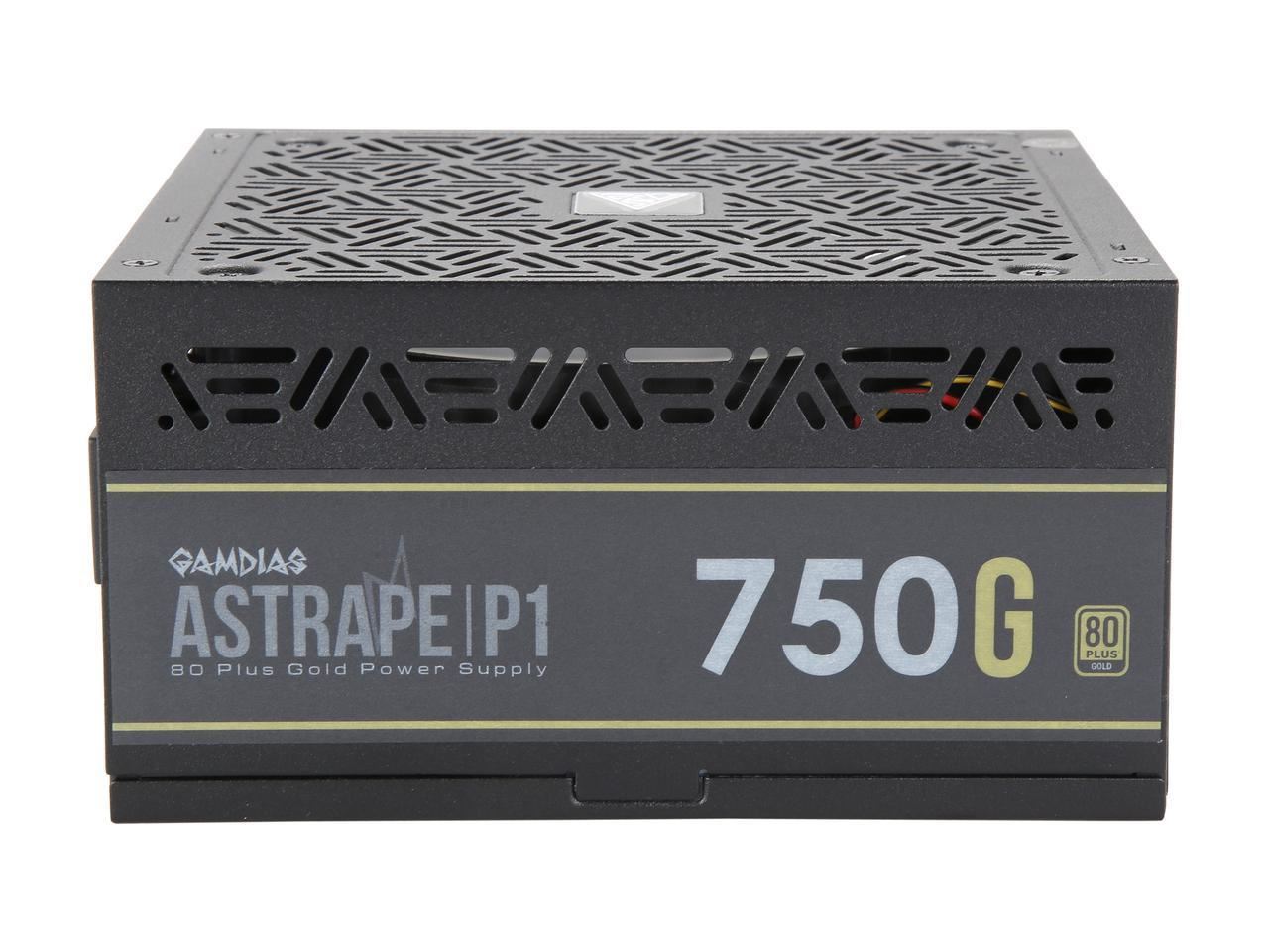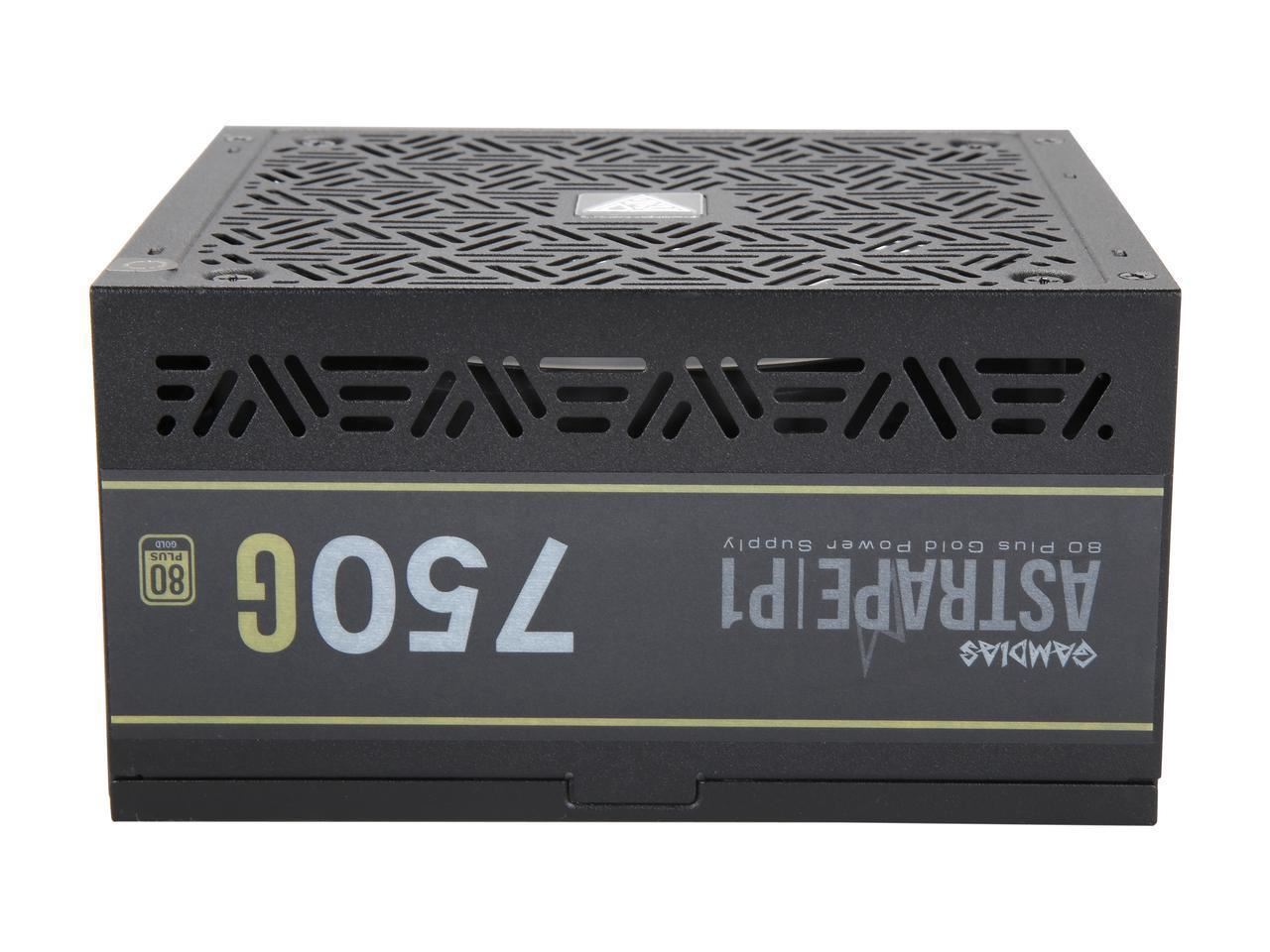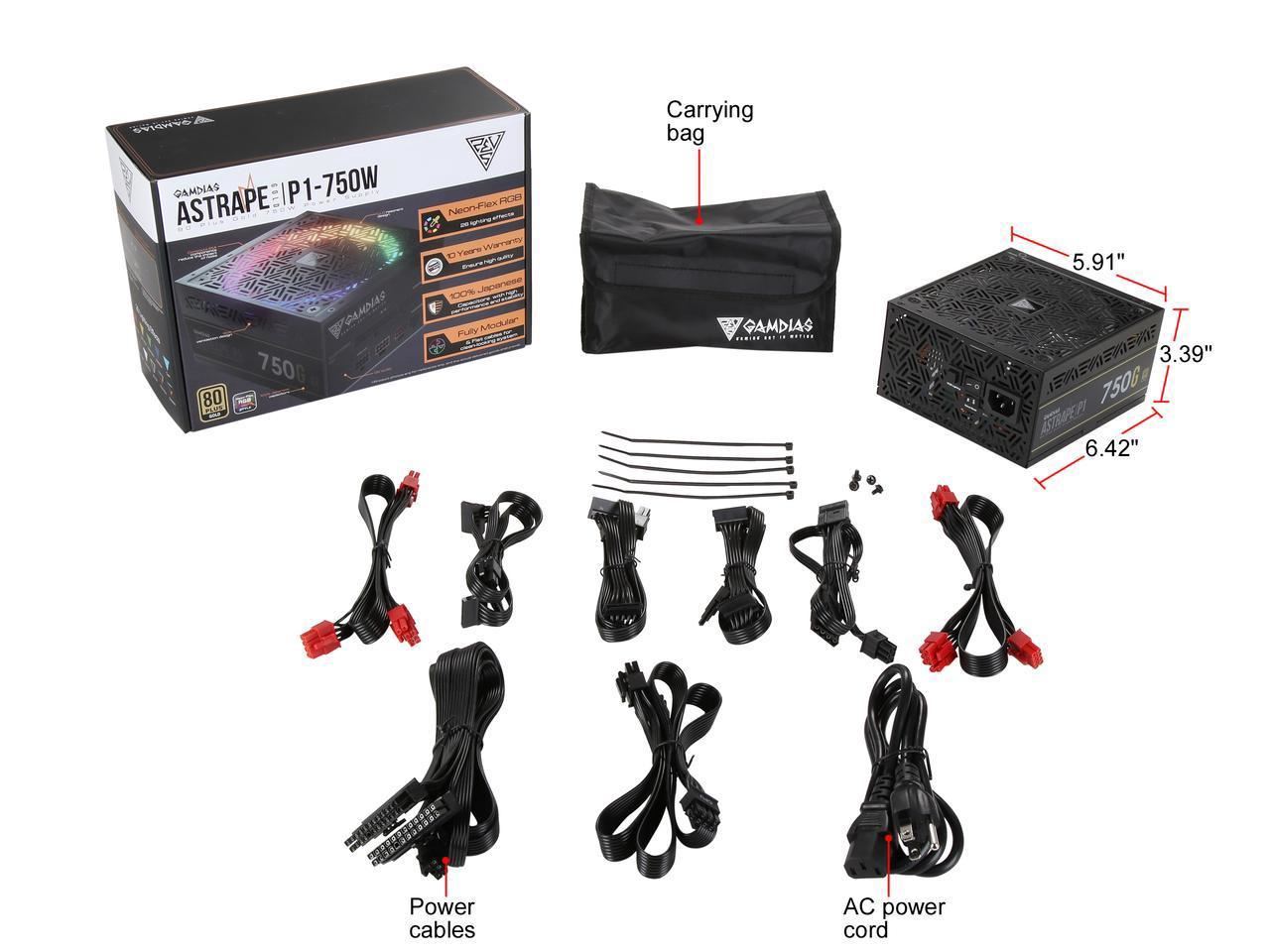 Gamdias Astrape P1 Gold 750W Full Modular PSU, certificata 80 PLUS Gold, eficienta 90%, single rail (62.5A), ventilator silentios de 140mm cu control termic automat(se poate activa/dezactiva din buton) cu iluminare RGB, 4x 6+2pin PCIE, 9x SATA, 3x Molex, 1x Floppy, 1x 4+4pin EPS12V, 1x 20+4pin, SCP/OVP/OPP/SP/ICP/OCP, Active PFC, dimensiuni: 86mm x 150mm x 140mm