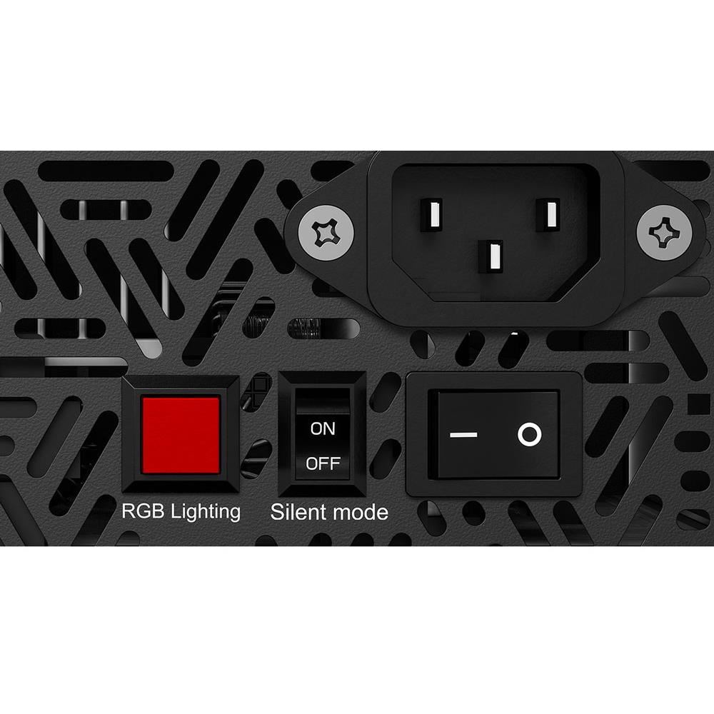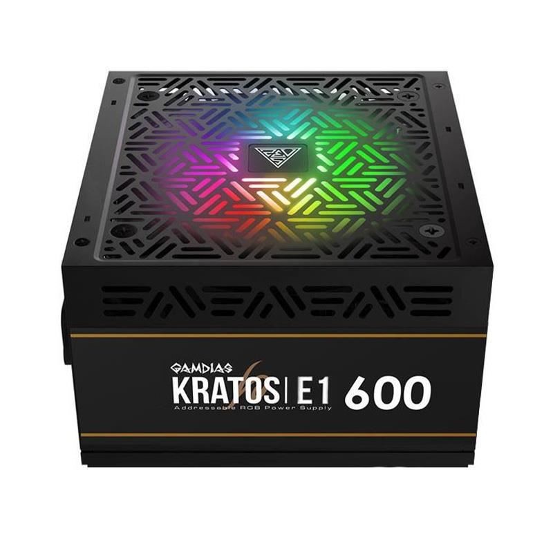 Sursa Gamdias Kratos E1 600W iluminare RGB, eficienta 80%, single rail (40.5A), ventilator silentios de 120mm cu control termic automat(se poate activa/dezactiva din buton), cu iluminare adresabila RGB, 2x 6+2pin PCIE, 5x SATA, 2x Molex, 1x Floppy, 1x 4+4pin EPS12V, 1x 20+4pin, OVP / UVP/ OPP/ SCP, Active PFC, dimensiuni: 86mmx150mmx140mm