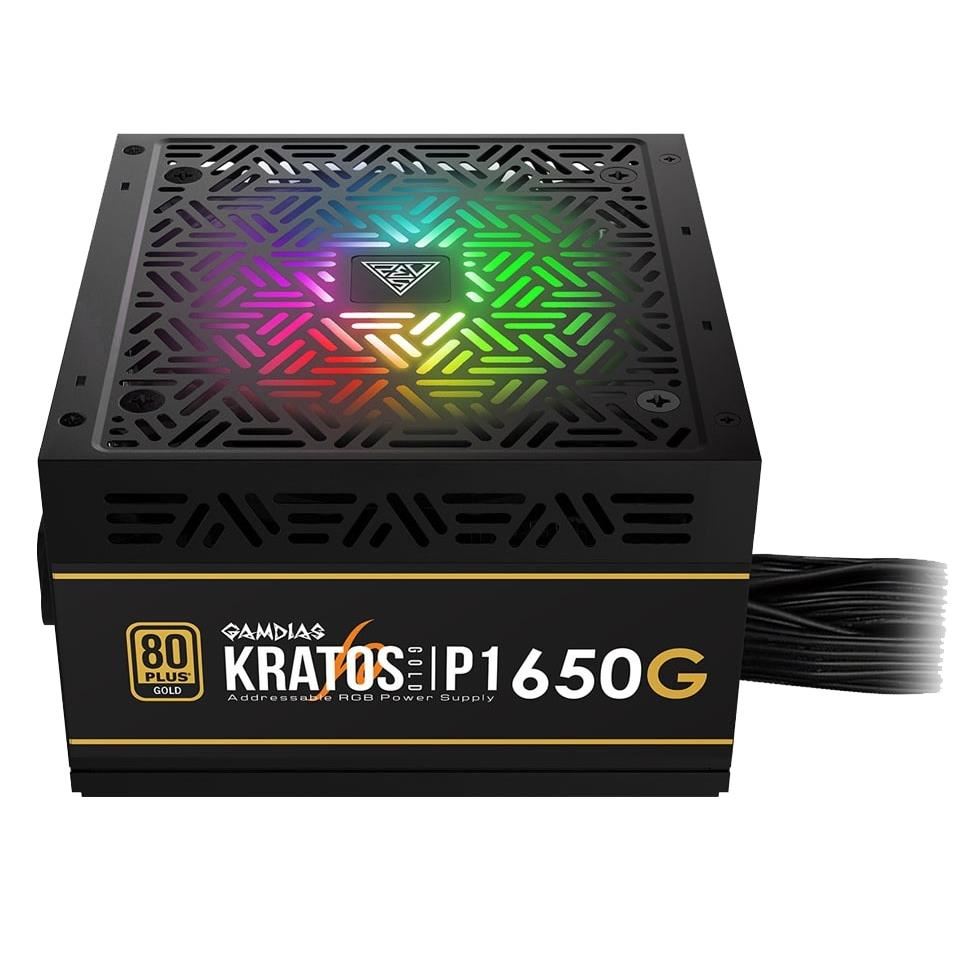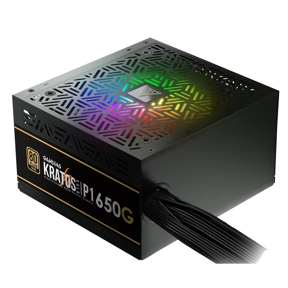 Sursa Gamdias Kratos P1 650W iluminare RGB, certificata 80 PLUS Gold, single rail (54.2A), ventilator silentios de 120mm cu control termic automat(se poate activa/dezactiva din buton) cu iluminare adresabila RGB, cabluri plate pentru un wire management mai bun, buton pentru pornire/oprire mod silentios (cand modul silentios este activat, ventilatorul isi regleaza viteza in functie de temperatura din interiorul sursei), 2x 6+2pin PCIE, 6x SATA, 3x Molex, 1x Floppy, 1x 4+4pin EPS12V, 1x 20+4pin, OVP/UVP/OPP/OCP/SCP/SP/ICP, Active PFC, dimensiuni: 86mmx150mmx140mm