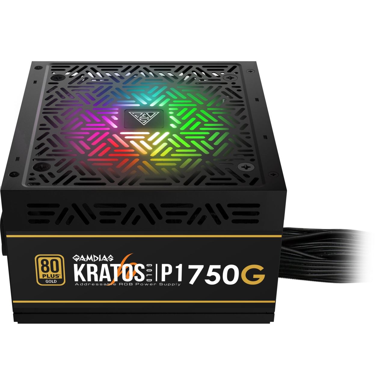 Sursa Gamdias Kratos P1 750W iluminare RGB, certificata 80 PLUS Gold, single rail (62.5A), ventilator silentios de 120mm cu control termic automat(se poate activa/dezactiva din buton) cu iluminare adresabila RGB, cabluri plate pentru un wire management mai bun, buton pentru pornire/oprire mod silentios (cand modul silentios este activat, ventilatorul isi regleaza viteza in functie de temperatura din interiorul sursei), 4x 6+2pin PCIE, 8x SATA, 3x Molex, 1x Floppy, 1x 4+4pin EPS12V, 1x 20+4pin, OVP/UVP/OPP/OCP/SCP/SP/ICP, Active PFC, dimensiuni: 86mmx150mmx140mm
