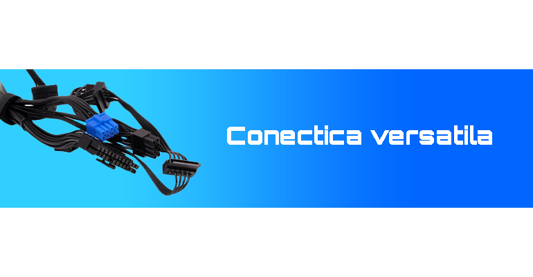 Sursa este echipata cu 1 conector de 24 de pini pentru alimentarea placii de baza, unul de 4+4 pini pentru alimentarea procesorului, 2 conectori 6+2 pini pentru alimentarea placii grafice, 4 conectori SATA si 2 conectori MOLEX pentru alimentarea unitatilor optice, a mediilor de stocare si a diverselor accesoriilor pentru carcase.