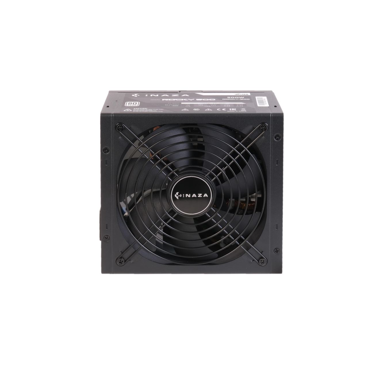 Sursa Inaza Rocky 500W, 80 PLUS, eficienta aproximativ 80%, single rail (41A), ventilator silentios de 140mm cu control termic automat, 2x 6+2pin PCIE, 4x SATA, 2x Molex, 1x 4+4pin EPS12V(600mm), 1x 24pin(500mm), OVP/SCP/OPP/UVP, Active PFC