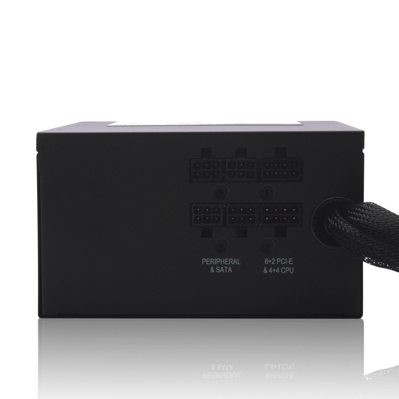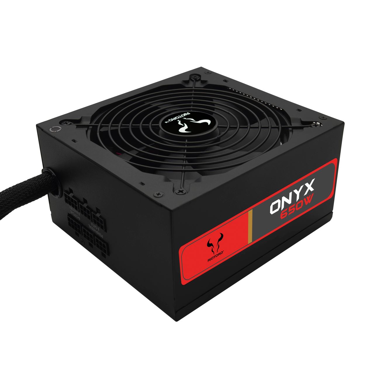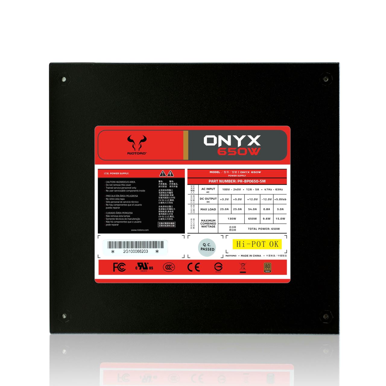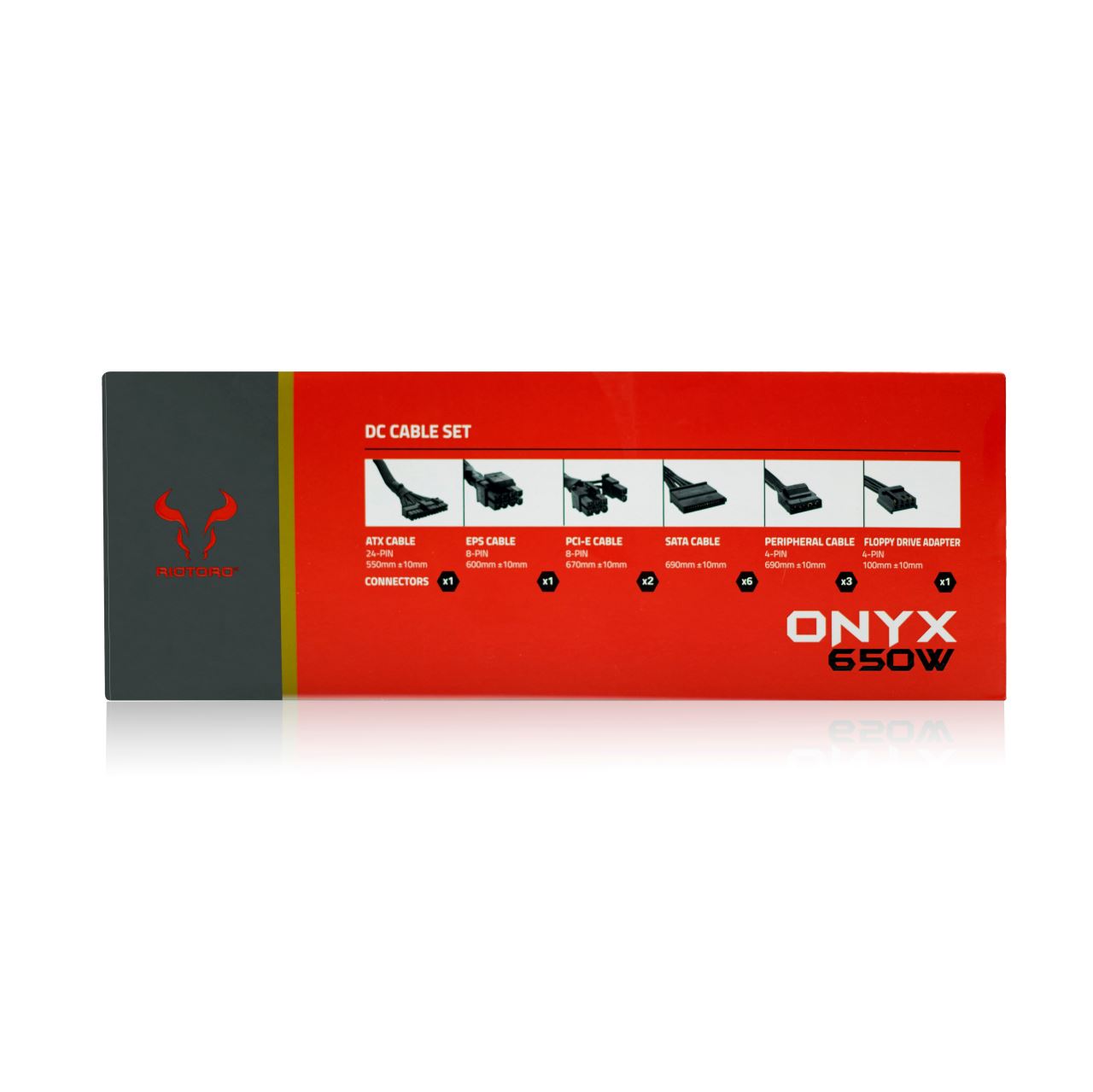 Sursa modulara Riotoro Onyx 650W, certificata 80 PLUS Bronze, eficienta 85%, single rail (54A), ventilator silentios de 120mm (Sleeve bearing), 2x 6+2pin PCIE(675mm), 6x SATA, 3x Molex, 1x 4+4pin EPS12V(650mm), 1x Floppy, protectii OVP/OPP/SCP, Active PFC, ATX 12V v2.4, dimensiuni (LxWxH): 140x150x86mm, greutate: 1.6kg