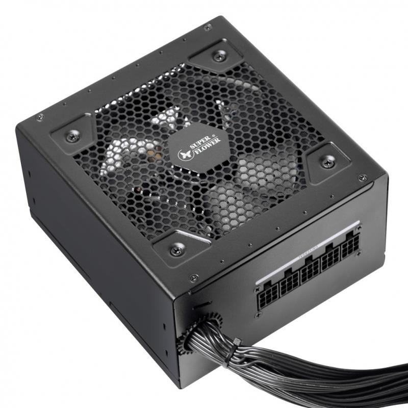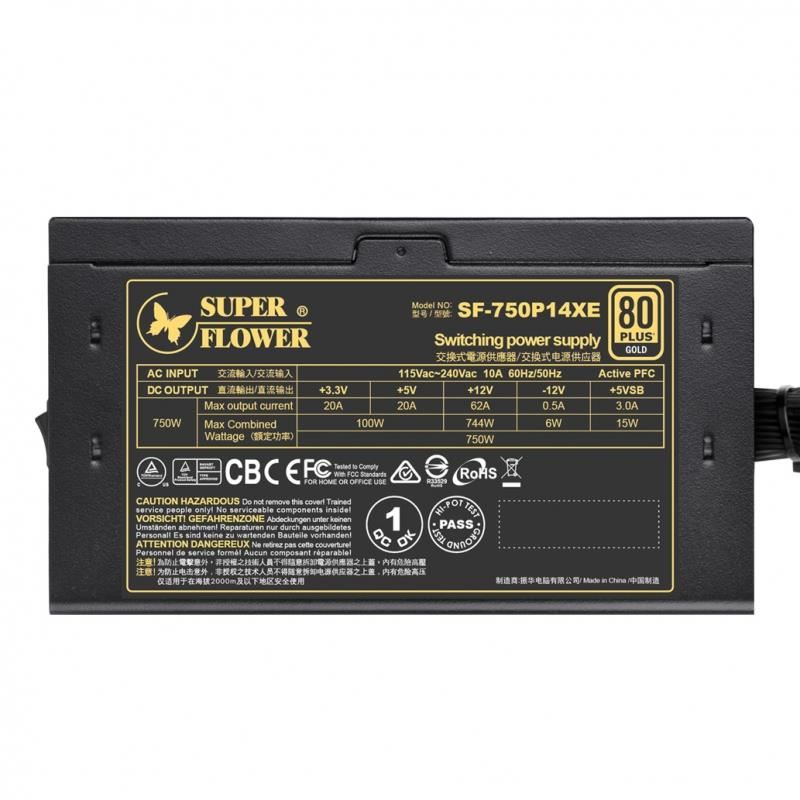 Sursa modulara Super Flower Legion GX Pro 750W neagra, certificata 80 PLUS Gold, eficienta 90%, cabluri plate pentru un wire management mai bun, single rail (62A), ventilator silentios de 120mm (F.D.B. Silent Fan), condensatori japonezi 105° (Nippon Chemi-Con), 4x 6+2pin PCIE, 9x SATA, 4x Molex, 2x 4+4pin EPS12V (700mm), 1x 24pin (600mm), protectii OVP/OCP/OPP/OTP/SCP/UVP/NLO/SIP, Active PFC, ATX 12V v2.32, SSI EPS 12V v2.92, dimensiuni (LxWxH): 160x150x86mm, certificari: cTÜVus / TÜV / CB / CE / FCC / RCM / BSMI / RoHS / KCC, greutate: 2.36kg
