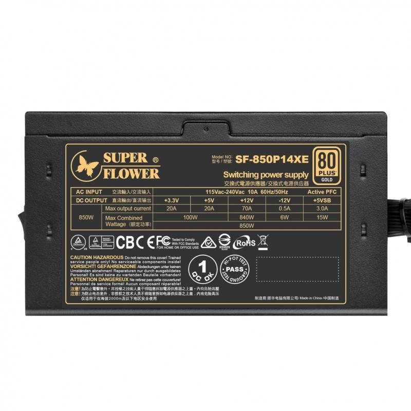 Sursa modulara Super Flower Legion GX Pro 850W neagra, certificata 80 PLUS Gold, eficienta 90%, cabluri plate pentru un wire management mai bun, single rail (70A), ventilator silentios de 120mm (F.D.B. Silent Fan), condensatori japonezi 105° (Nippon Chemi-Con), 4x 6+2pin PCIE, 9x SATA, 4x Molex, 2x 4+4pin EPS12V (700mm), 1x 24pin (600mm), protectii OVP/OCP/OPP/OTP/SCP/UVP/NLO/SIP, Active PFC, ATX 12V v2.32, SSI EPS 12V v2.92, dimensiuni (LxWxH): 160x150x86mm, certificari: cTÜVus / TÜV / CB / CE / FCC / RCM / BSMI / RoHS / KCC, greutate: 2.38kg