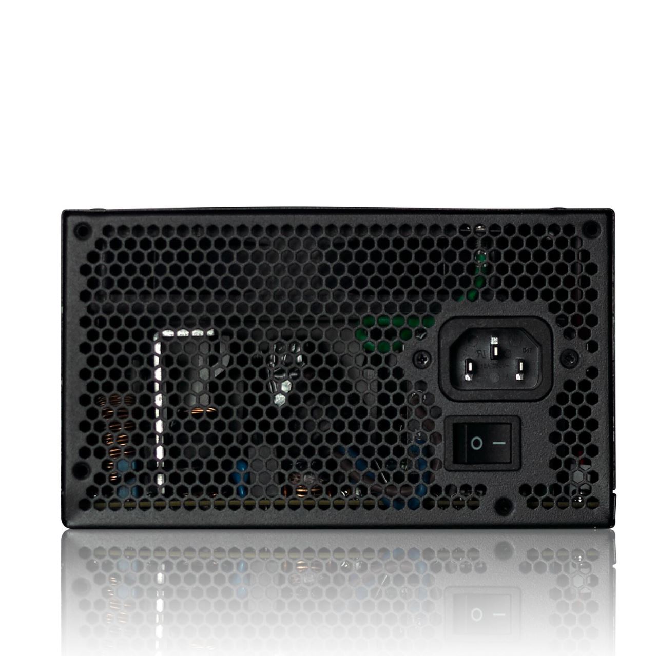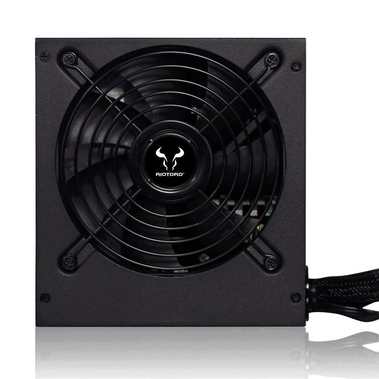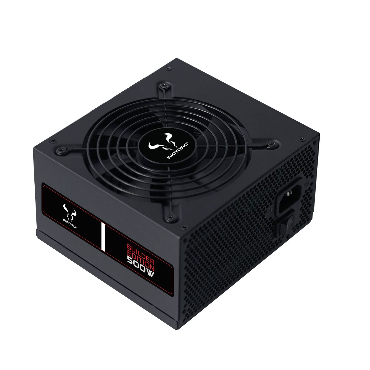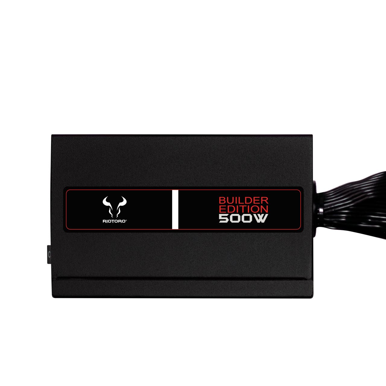 Sursa Riotoro Builder Edition 500W, certificata 80 PLUS, eficienta 85%, single rail (41.68A), ventilator silentios de 120mm (Sleeve bearing), 2x 6+2pin PCIE(675mm), 6x SATA, 3x Molex, 1x 4+4pin EPS12V(600mm), cabluri plate, protectii OVP/OPP/SCP, Active PFC, ATX 12V v2.4, dimensiuni (LxWxH): 140x150x86mm, greutate: 1.66kg