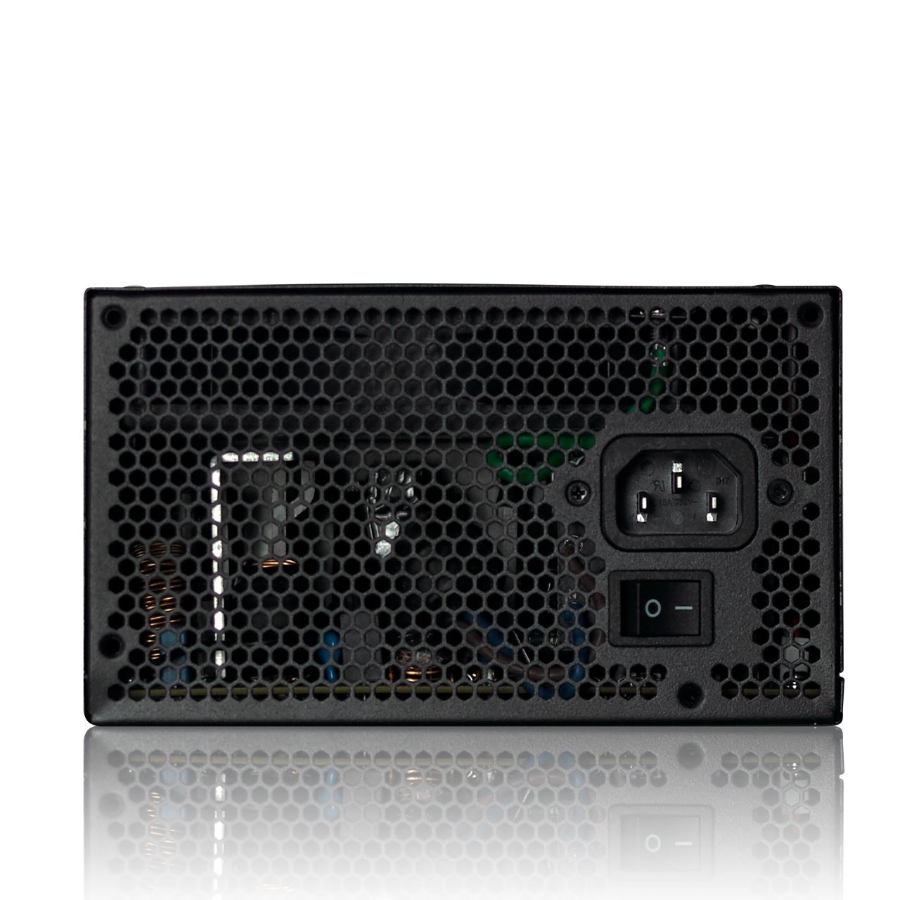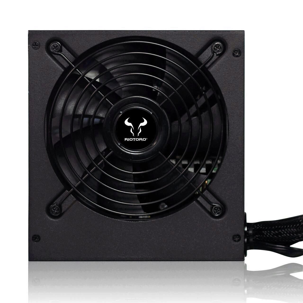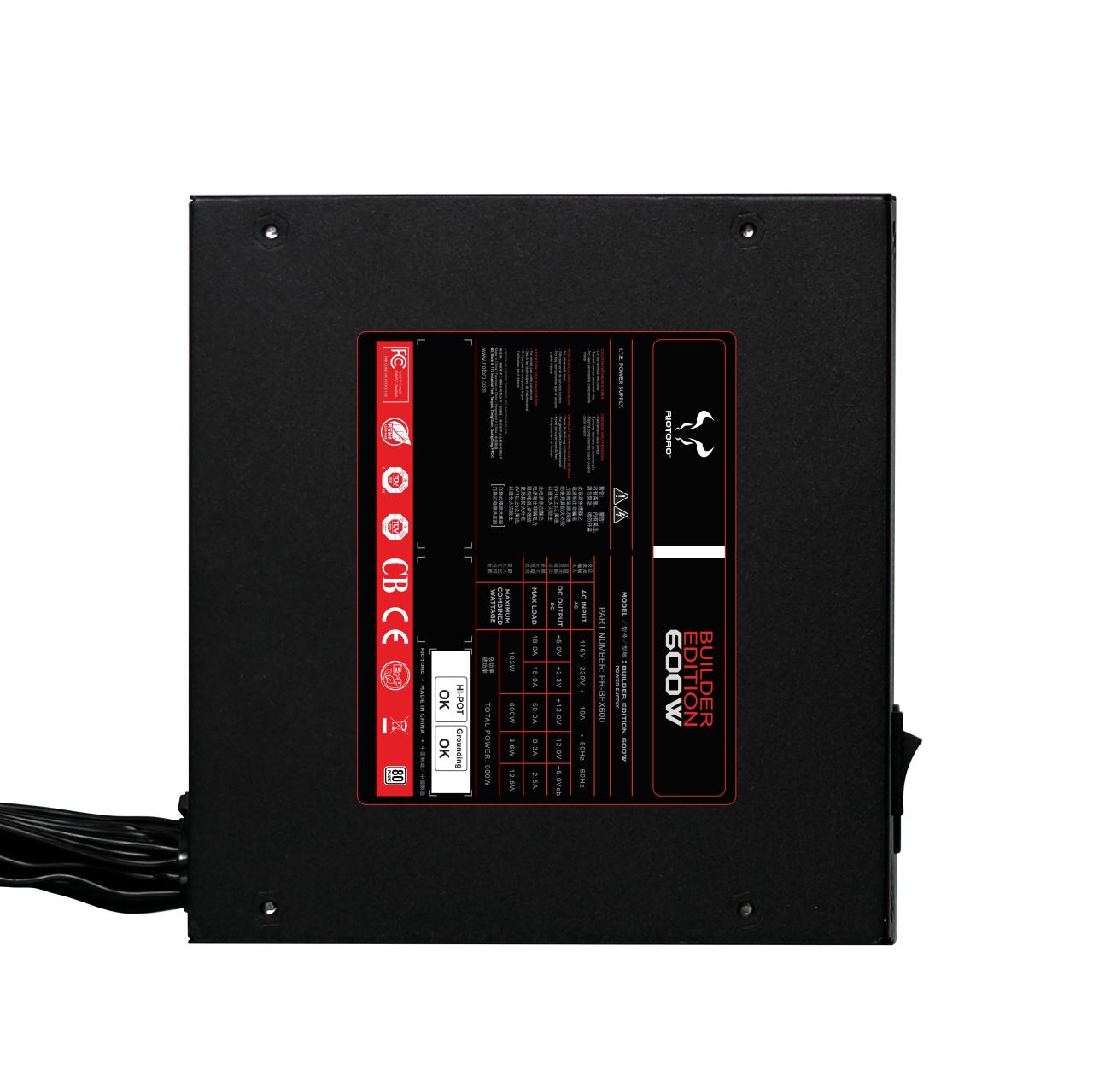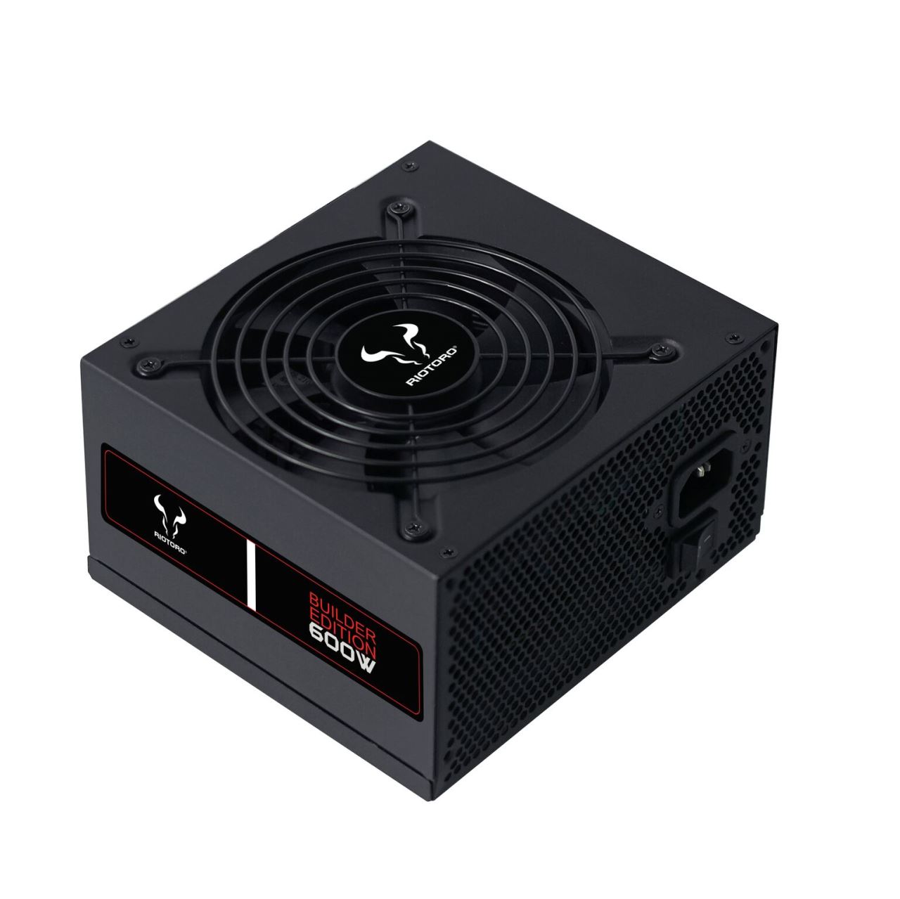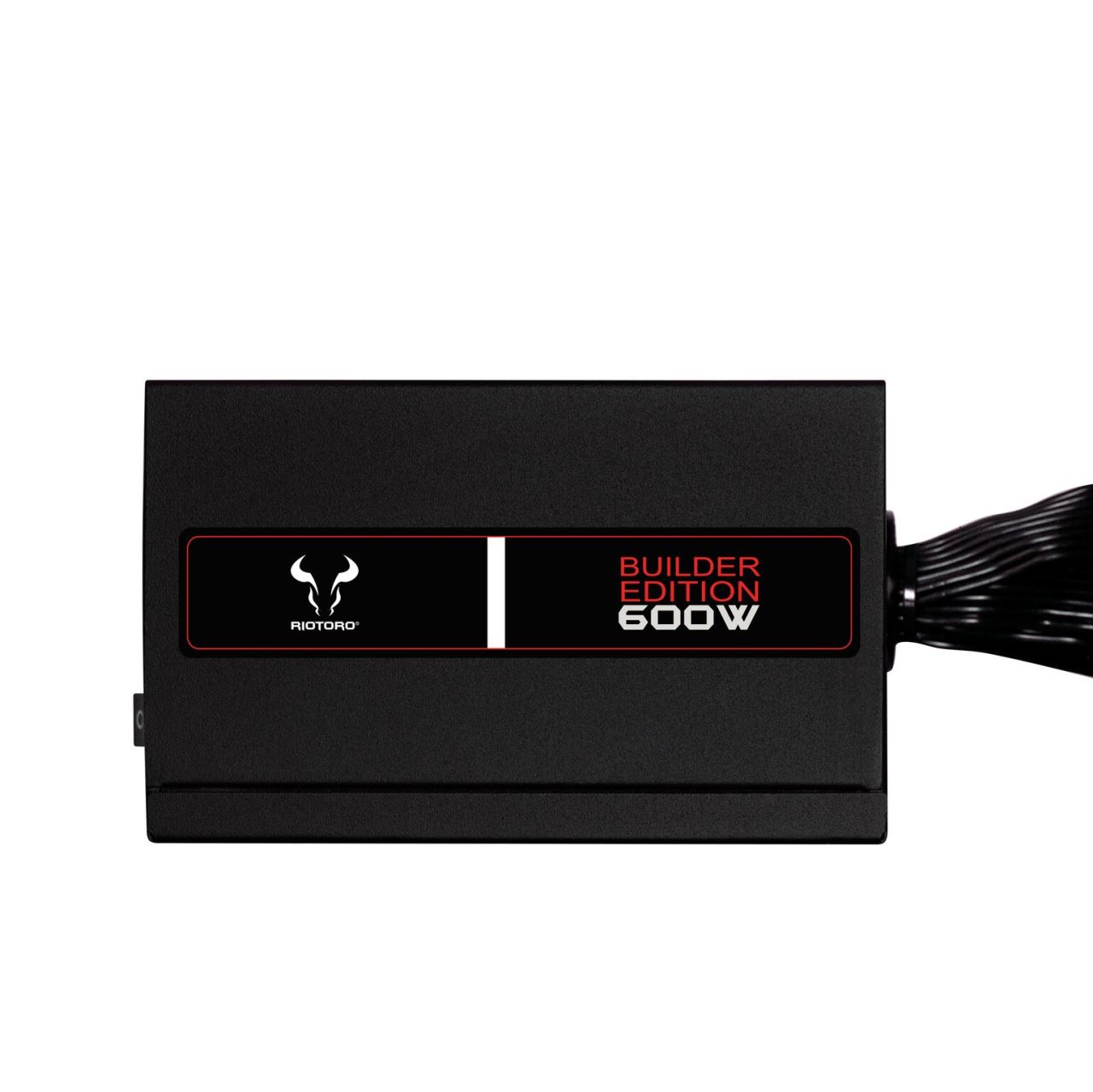Sursa Riotoro Builder Edition 600W, certificata 80 PLUS, eficienta 85%, single rail (50A), ventilator silentios de 120mm (Sleeve bearing), 2x 6+2pin PCIE(675mm), 6x SATA, 3x Molex, 1x 4+4pin EPS12V(600mm), cabluri plate, protectii OVP/OPP/SCP, Active PFC, ATX 12V v2.4, dimensiuni (LxWxH): 140x150x86mm, greutate: 1.66kg