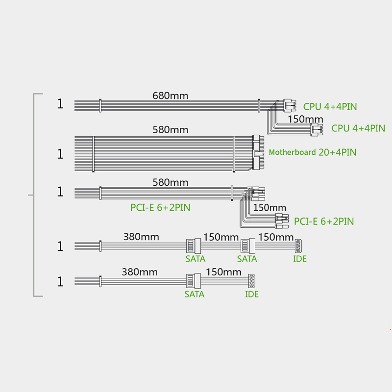 Segotep AN650W vine echipata cu o gama variata de conectori pentru a asigura compatibilitatea cu majoritatea componentelor si configuratiilor moderne. Cei 2 conectori PCIE 6+2 pin sunt ideali pentru alimentarea placilor video de ultima generatie, in timp ce cei 3 conectori SATA si cei 2 Molex asigura conectivitatea pentru diverse dispozitive de stocare si periferice. Conectorii EPS12V (4+4 pin) si ATX (24 pin) ofera suport pentru alimentarea procesorului si a placii de baza, garantand o instalare usoara si flexibila.
