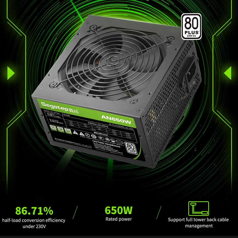 Sursa de alimentare Segotep AN650W 650W este o componenta esentiala pentru orice sistem de calcul, oferind o combinatie excelenta de putere, eficienta si fiabilitate. Aceasta sursa de alimentare este proiectata pentru a satisface cerintele energetice ale sistemelor moderne, fiind potrivita atat pentru utilizatorii casnici, cat si pentru cei entuziasti de gaming sau profesionisti care necesita o sursa de putere stabila si de incredere.