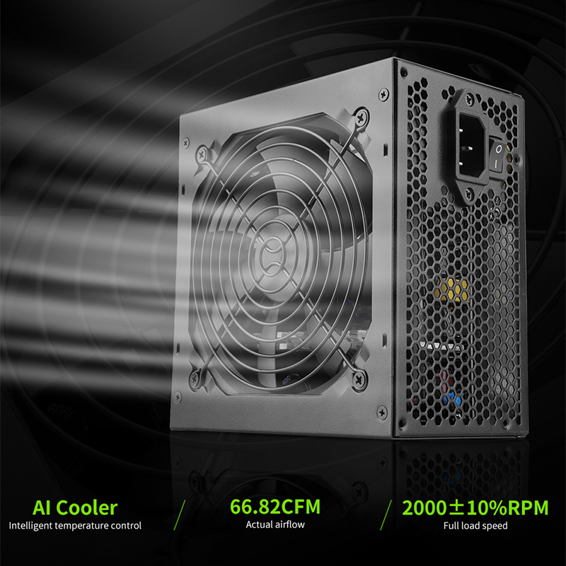 Ventilatorul de 120mm este proiectat pentru a functiona silentios, chiar si atunci cand sistemul este supus unei sarcini mari. Controlul termic automat ajusteaza viteza ventilatorului in functie de temperatura interna a sursei de alimentare, asigurand o racire eficienta fara a produce zgomot excesiv. Acest aspect este important pentru utilizatorii care doresc un mediu de lucru sau de joc linistit si fara interferente acustice.