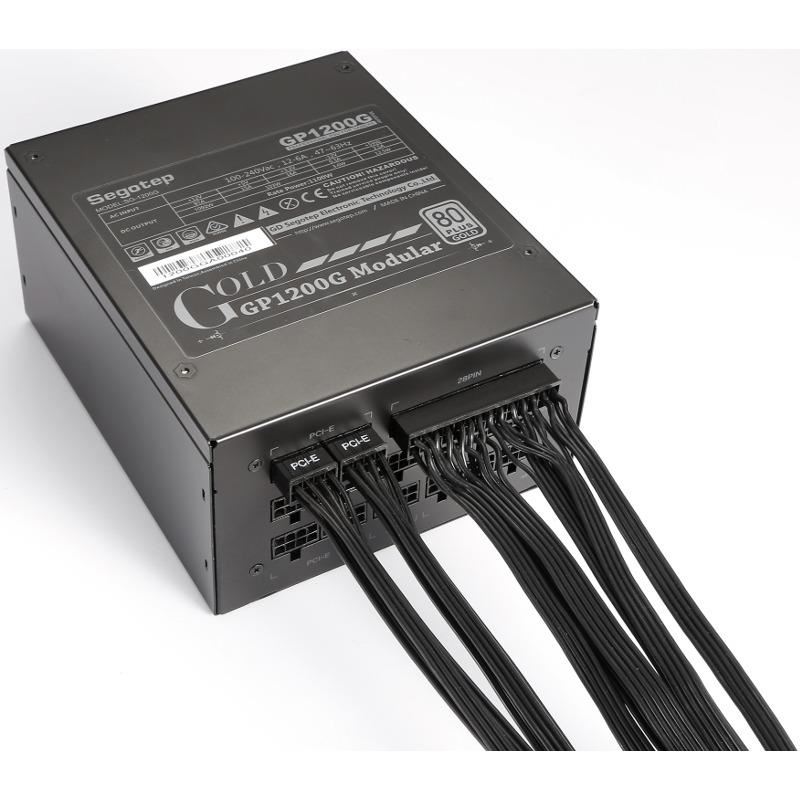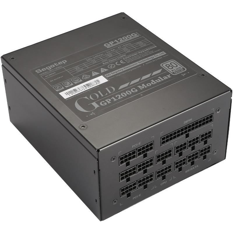 Segotep GP1200G 1100W Modular PSU, certificata 80 PLUS Gold, eficienta 90%, single rail (91A), ventilator silentios de 140mm cu control termic automat, 4x 6+2pin PCIE (suporta maxim 12x 6+2pin PCIE), 8x SATA, 6x Molex, 2x 4+4pin EPS12V, protectii OVP/OCP/OPP/SCP/UVP, Active PFC, ATX 12V v2.31, EPS 12V v2.93